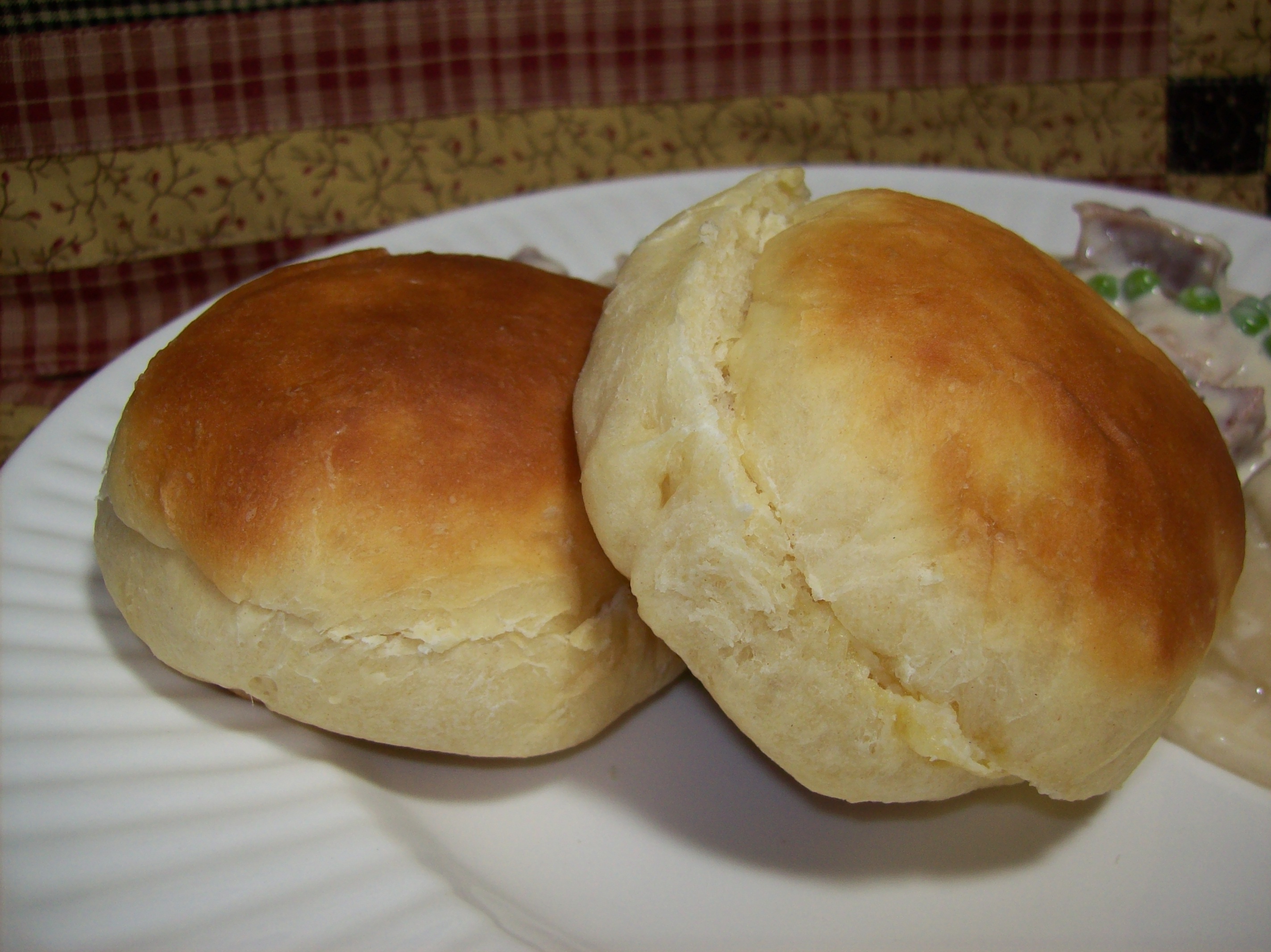 Add all ingredients in order specified by your bread machine manufacturer. Press dough cycle and let run until finished. If you don't have a dough cycle, let the machine run through the first kneading and first rise and then remove. Take dough out of bread machine and put on lightly floured surface. Roll into thick log with hands and cut into 12 equal pieces. Shape as desired and put onto a greased cookie sheet or jelly roll pan. Cover with a clean towel and let rise in a warm area for 30 to 45 minutes or until doubled in size. (Hint: Turn oven on at 150 degrees for one minute, turn off and let rolls rise in warm oven) When ready, preheat oven to 400 degrees. Bake rolls at 400 degrees for 12 to 15 minutes or until golden brown.