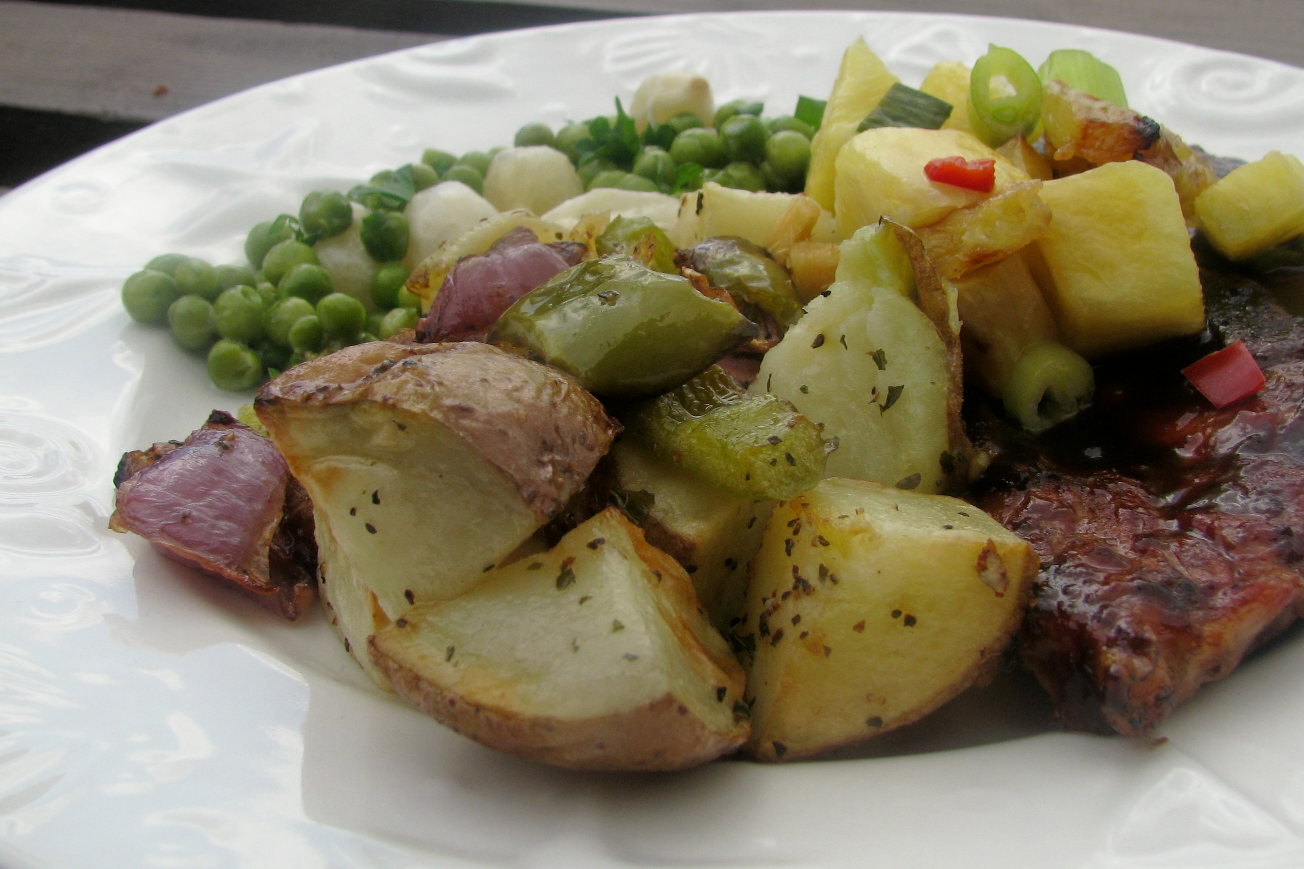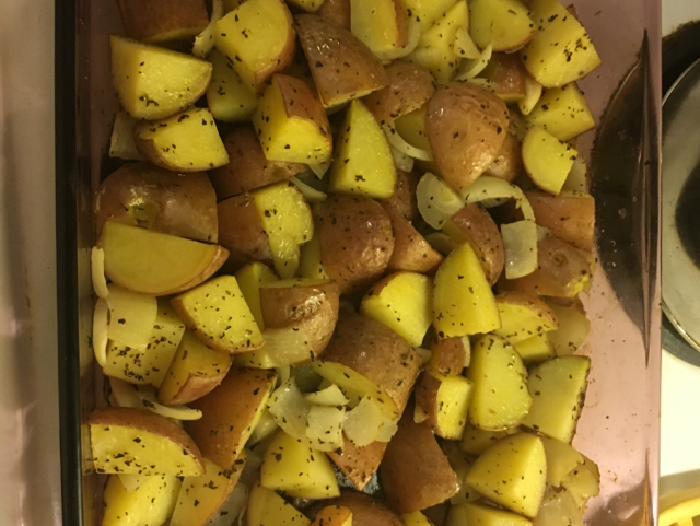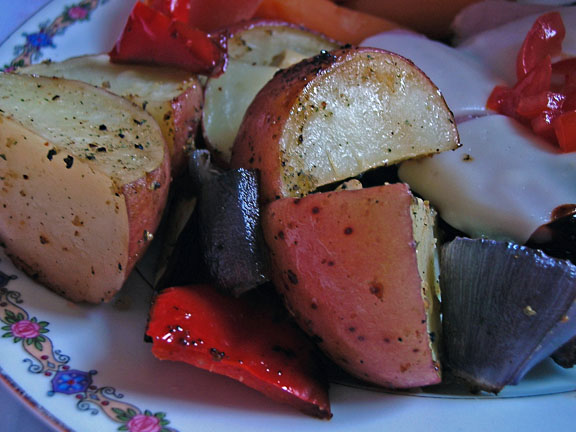 3?4 lb baby red potato, washed, quartered 1?2 medium bell pepper, cut in 1/2-inch chunks 1?2 large red onion, cut in 1/2-inch chunks 10 medium garlic cloves, peeled 1 tablespoon olive oil 1?2 teaspoon dried basil salt and pepper