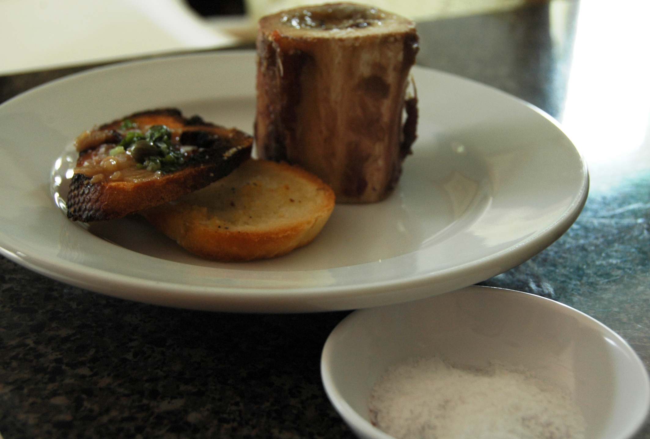8 -12 beef bones with marrow, 3 inches long, 3 to 4 pounds total 1 cup fresh parsley, roughly chopped 2 shallots, thinly sliced 2 teaspoons capers 1 1?2 tablespoons extra virgin olive oil 2 teaspoons fresh lemon juice coarse sea salt crusty bread, 1/4 inch slices, toasted