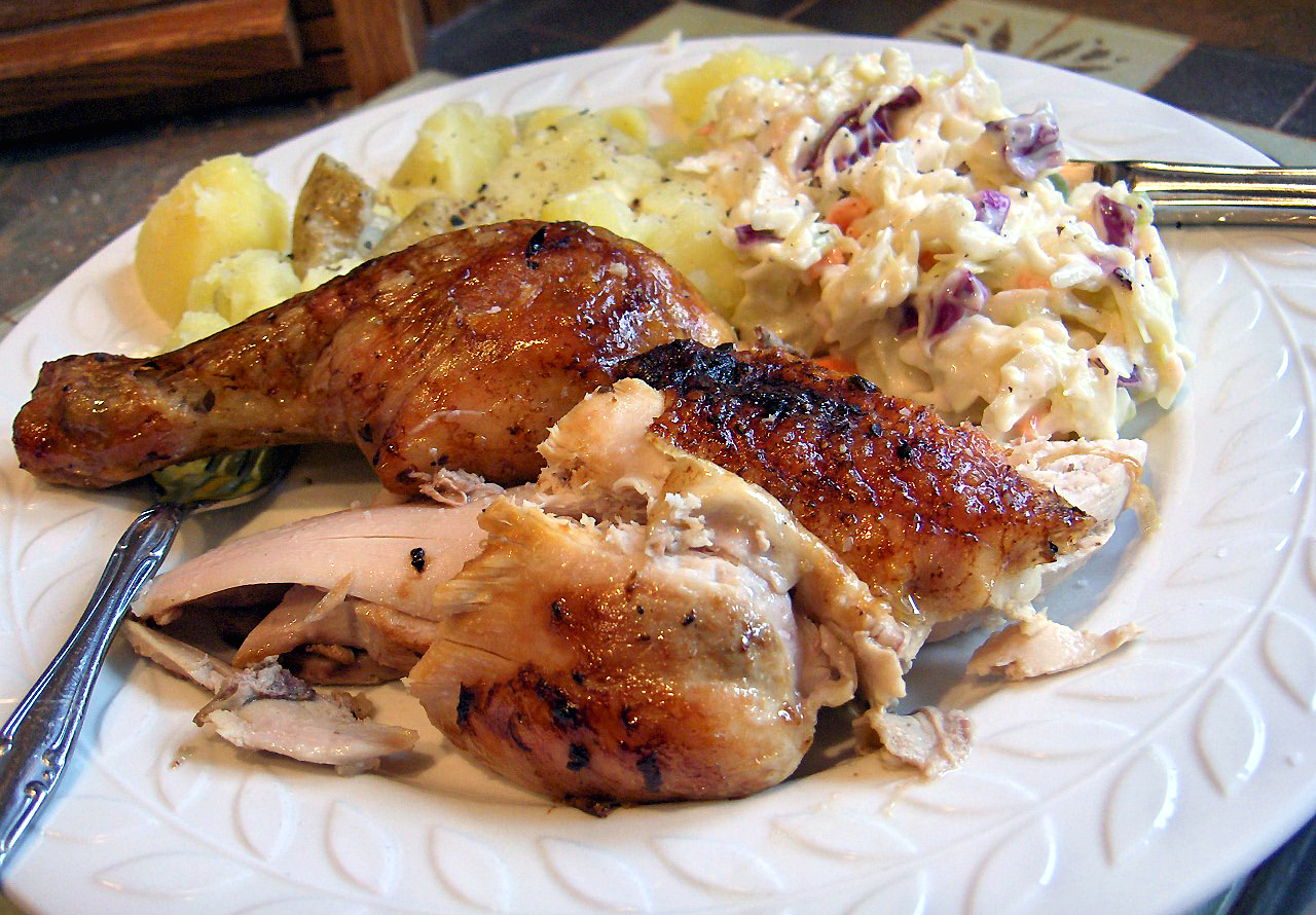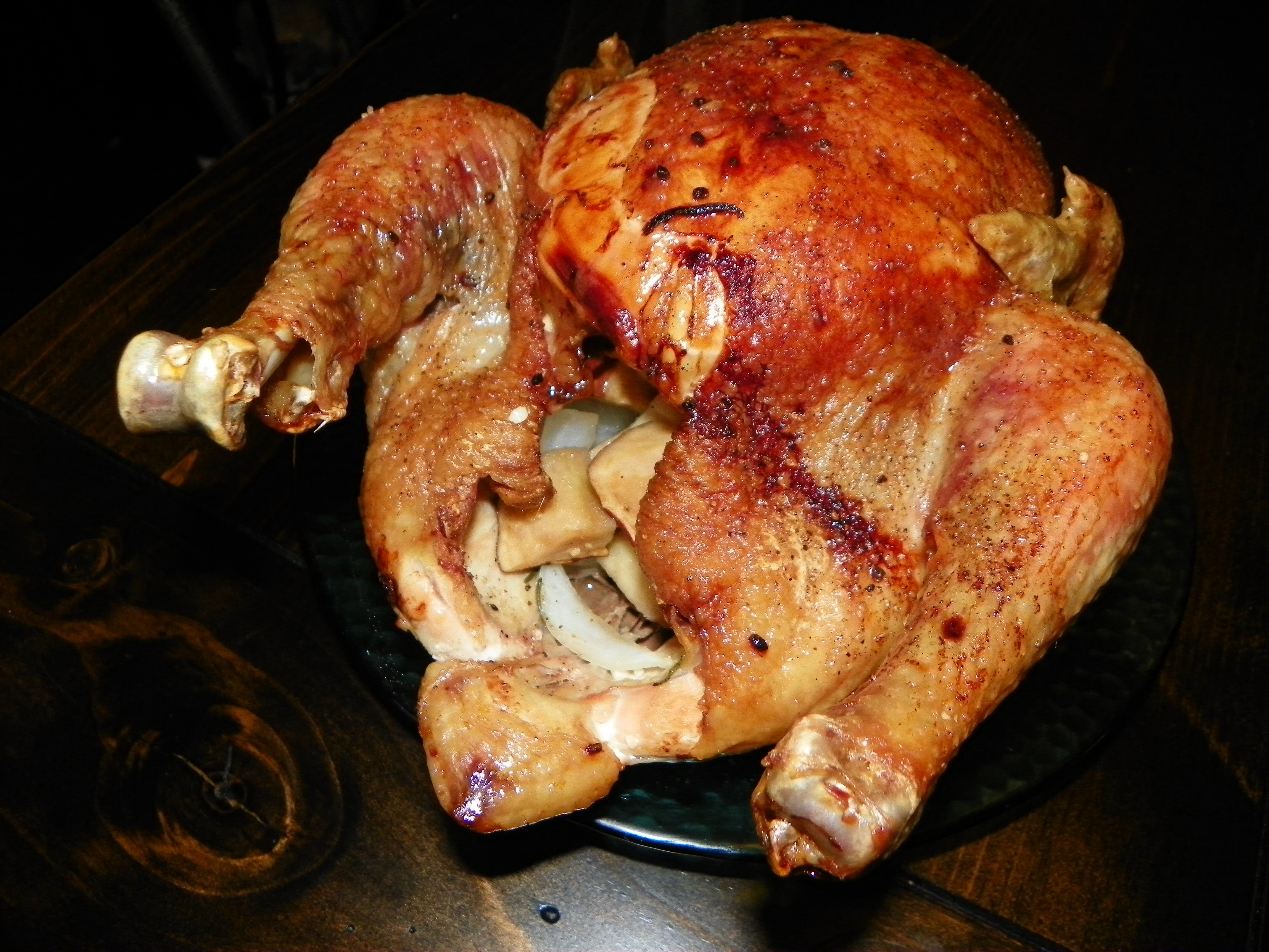 1 whole chicken 1 stalk celery 1 sweet apple (Cored) 2 cloves garlic olive oil salt pepper (Cracked, if wanted)