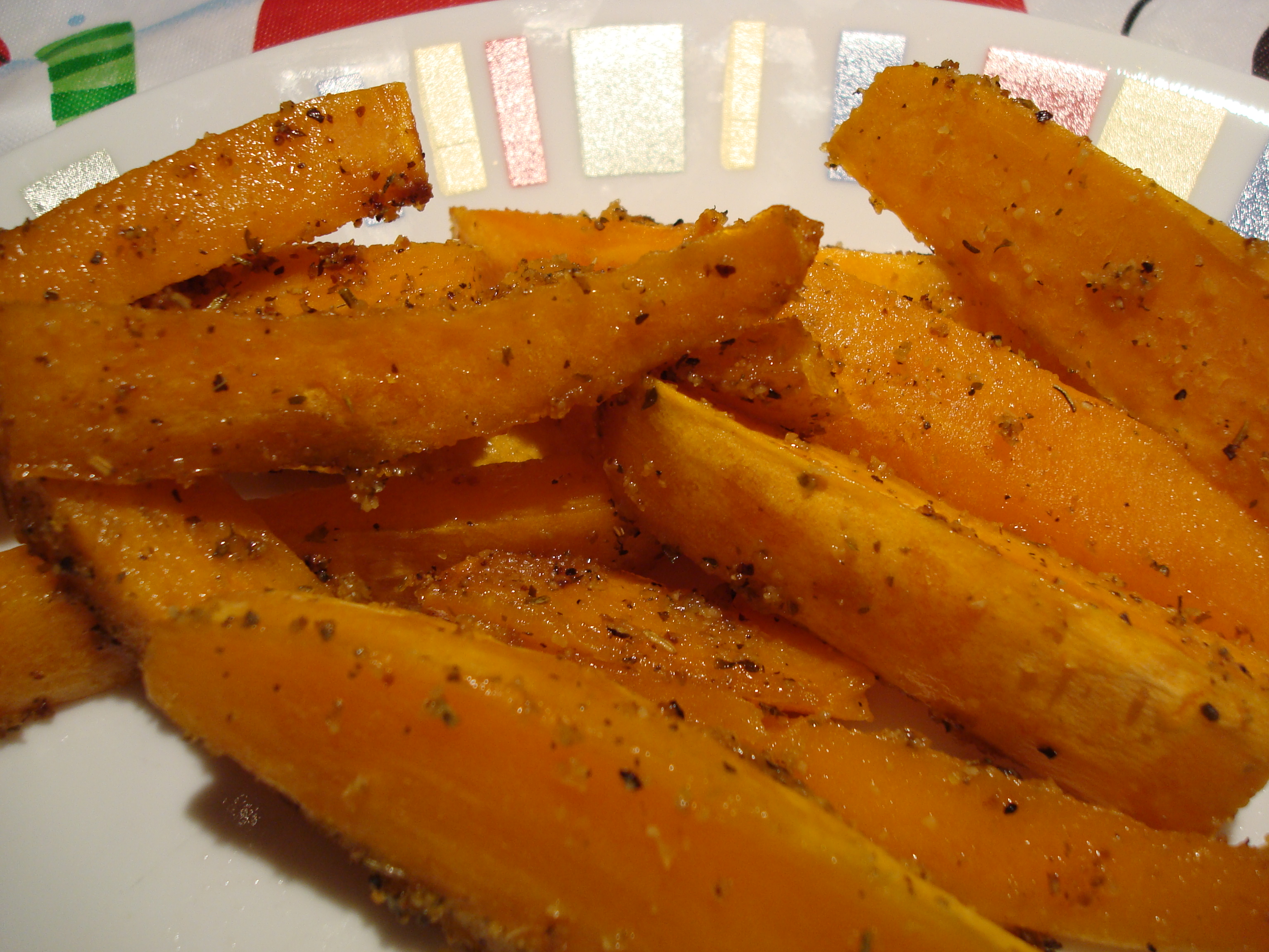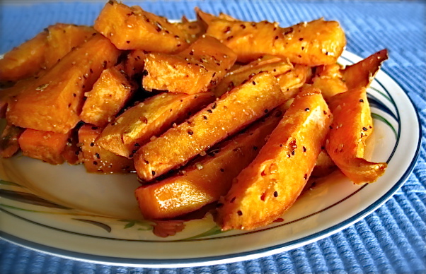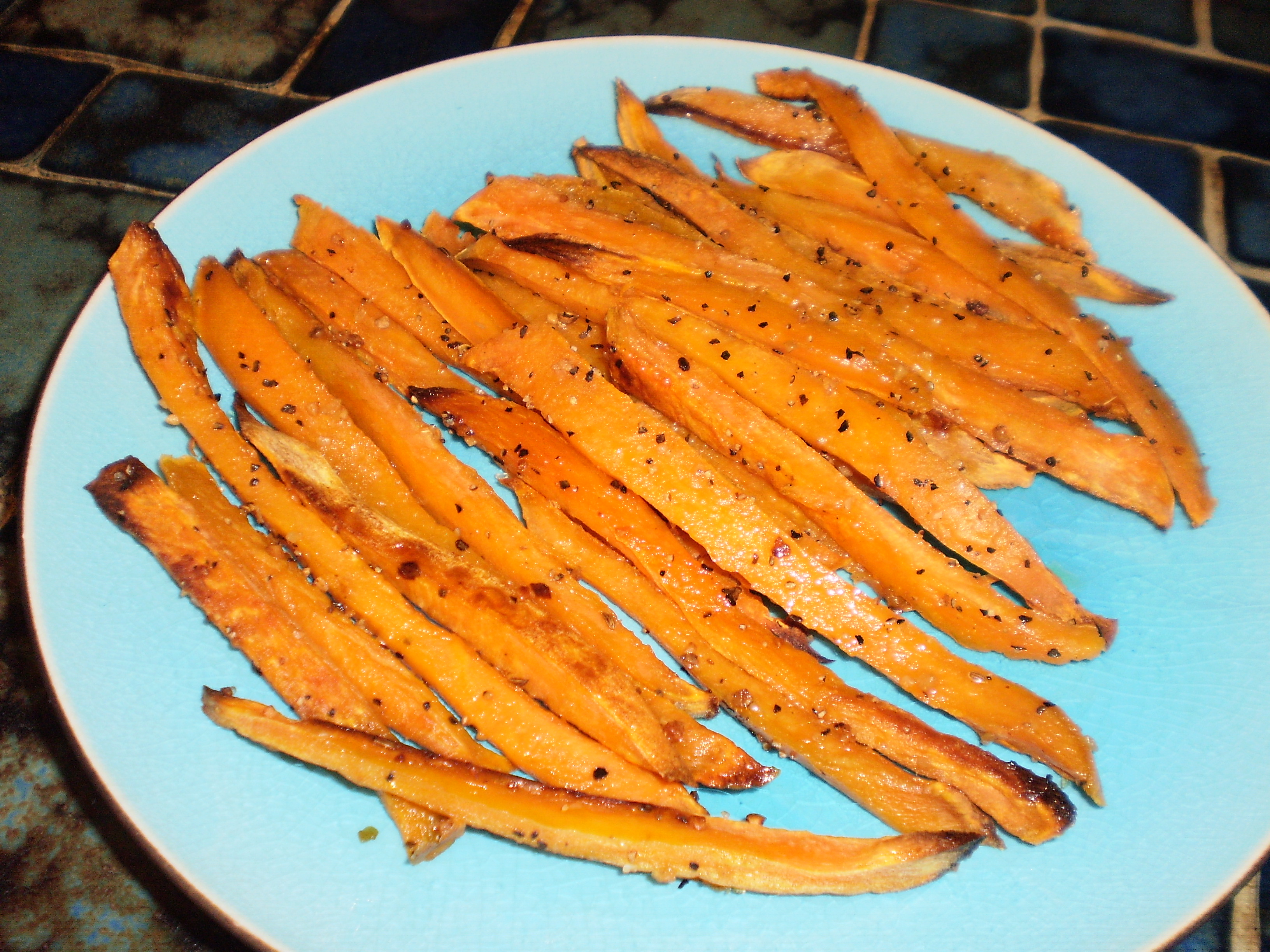4 sweet potatoes (cut into fries) 1 tablespoon McCormick's Montreal Brand steak seasoning (black pepper) salt olive oil, to drizzle