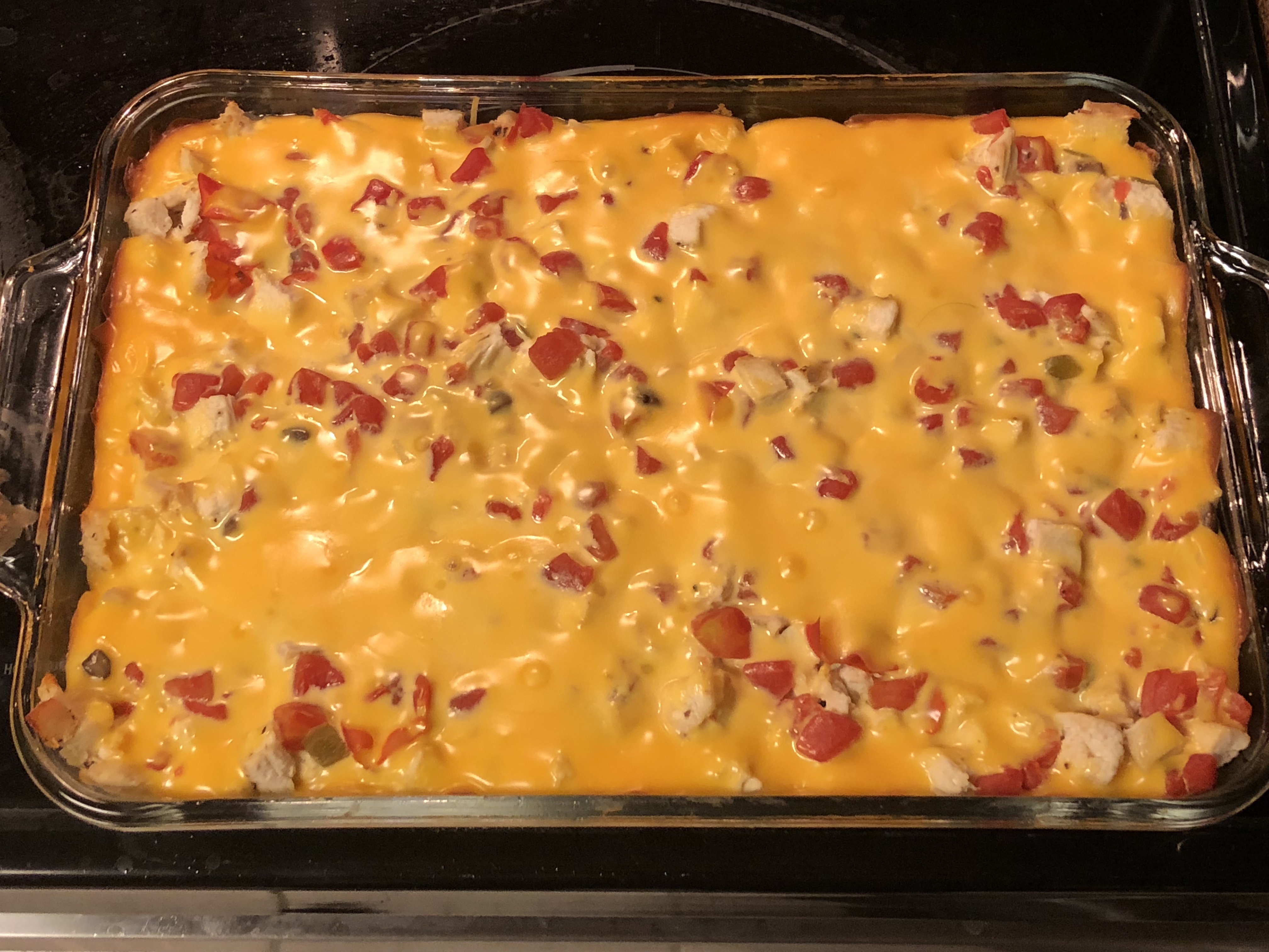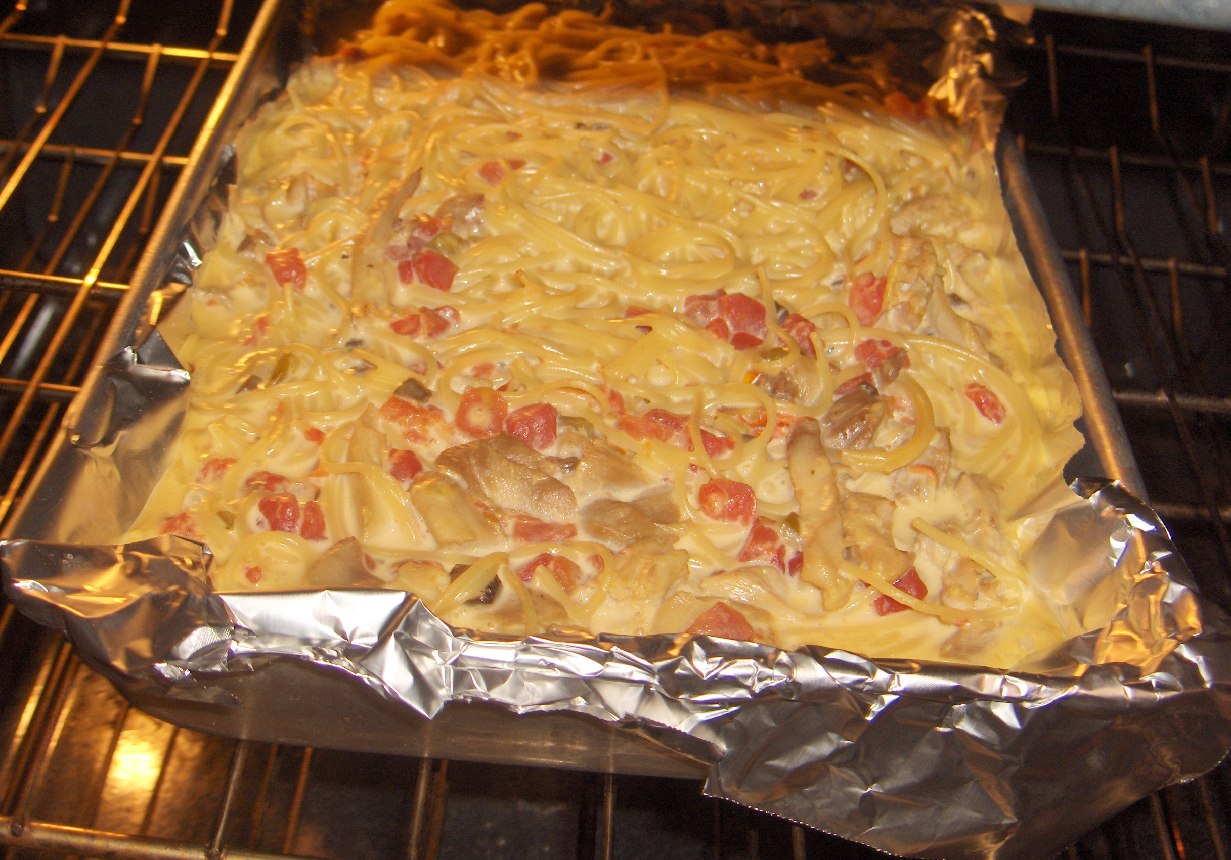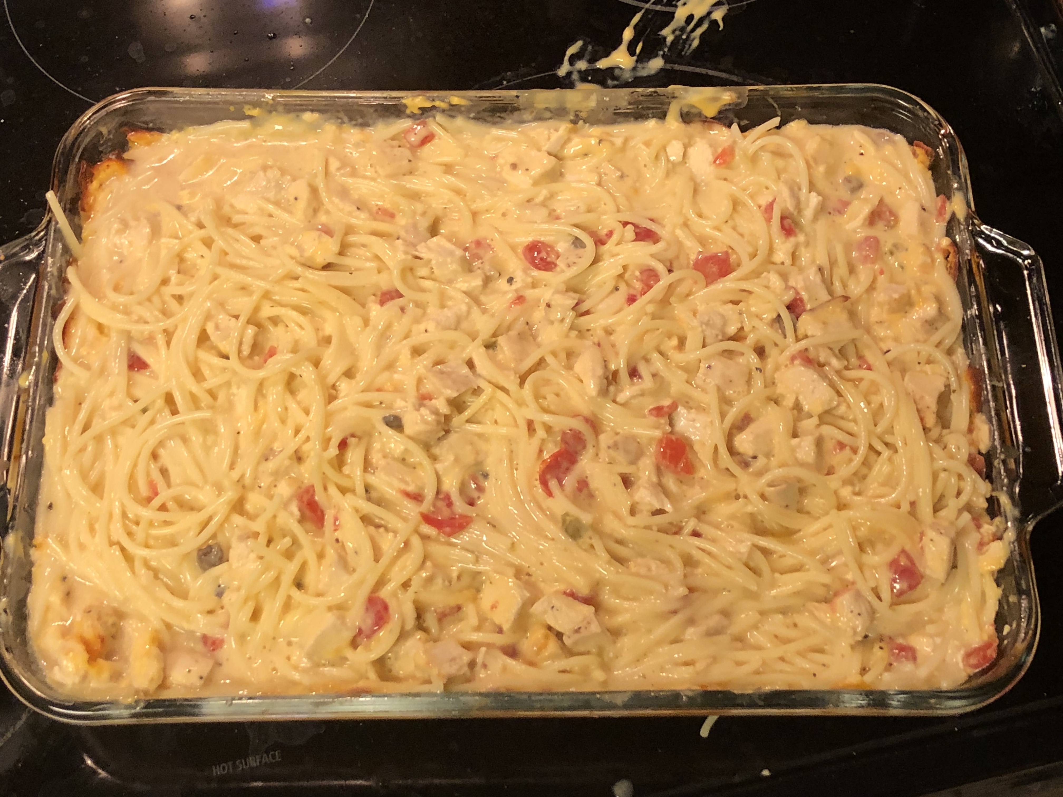 4 -6 chicken breasts, cooked & chopped 1 can cream of mushroom soup 1 can chicken broth 1 can Ro-Tel tomatoes 1 lb Velveeta cheese, cubed 12 ounces spaghetti, cooked & drained