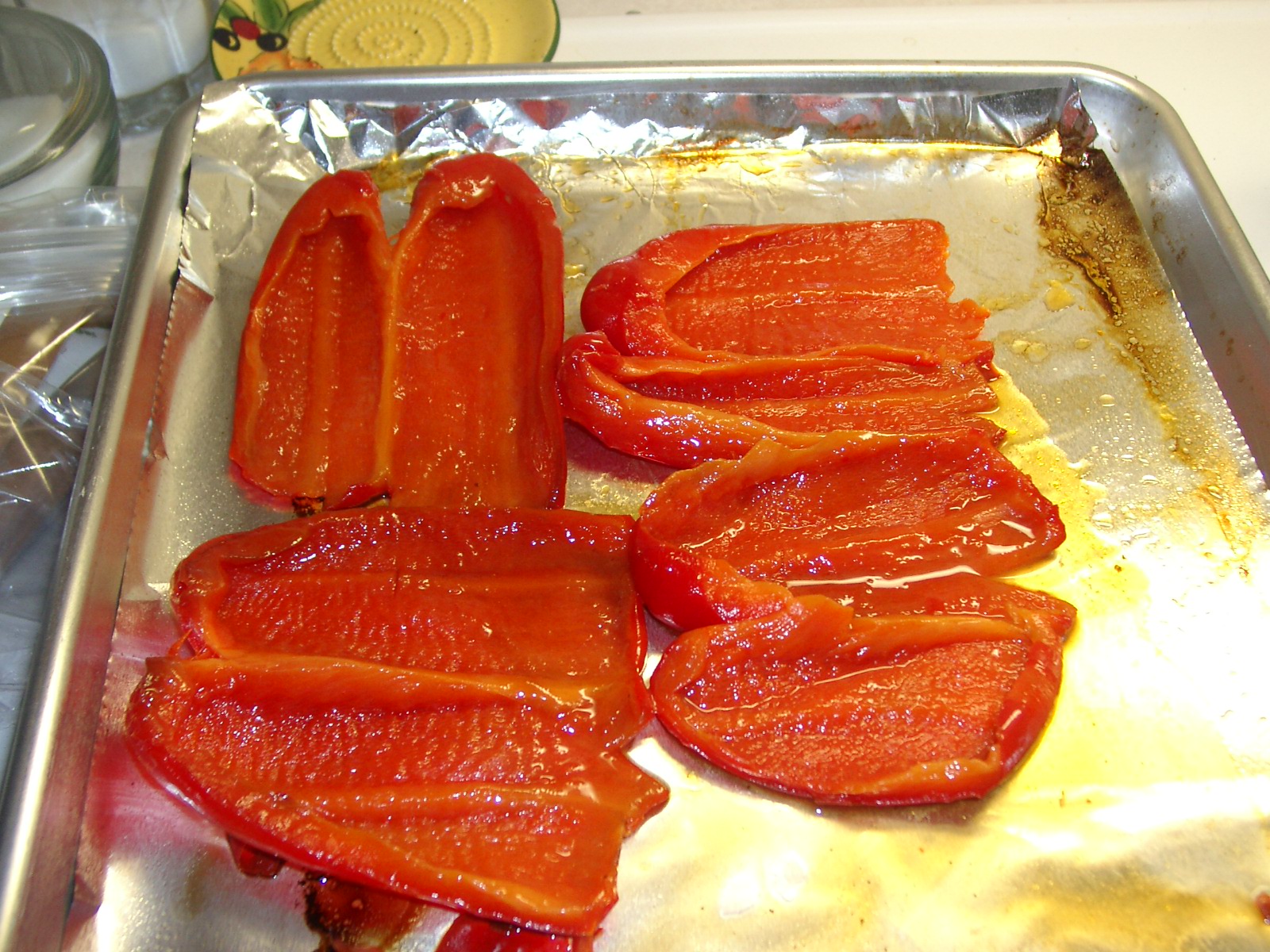 Heat oven to 450F degrees. Wash peppers and cut in half. Remove seeds and stems. Place upside down (skin side up) on a cookie sheet coated with olive oil spray. Bake for 10-15 minutes or so, until skin of pepper is seriously black. Make sure there are no sparks or actively burning ashes on the peppers and place peppers in a brown bag for about 10-15 minutes. This steams the peppers so the skins easily peel off. Rinsing peppers takes away all the roasted flavor, so don't let me catch you doing that. Let cool so you can touch them. Skin will peel off easily. Cut halves into strips, or however you need them to be cut. Now you know how to roast a red pepper! Good for: Chicken, cheese sauces, tomato sauces, topped on foccacia bread, or a million other things! You can also roast a pepper by placing it directly on the burner of a gas stove (NOT ELECTRIC!) turning with tongs every few minutes till skin is black. Continue with paper bag step.