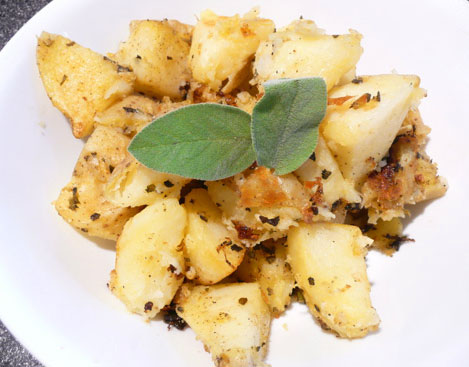 1 kg potato (unpeeled, Desiree recommended) 1?3 cup sage leaf (finely chopped) 1 tablespoon lemon zest (finely grated) 1 1?2 tablespoons extra virgin olive oil 1 tablespoon water 2 garlic cloves (large, crushed or minced) 1?2 teaspoon ground black pepper extra sage leaf (to garnish) (optional)