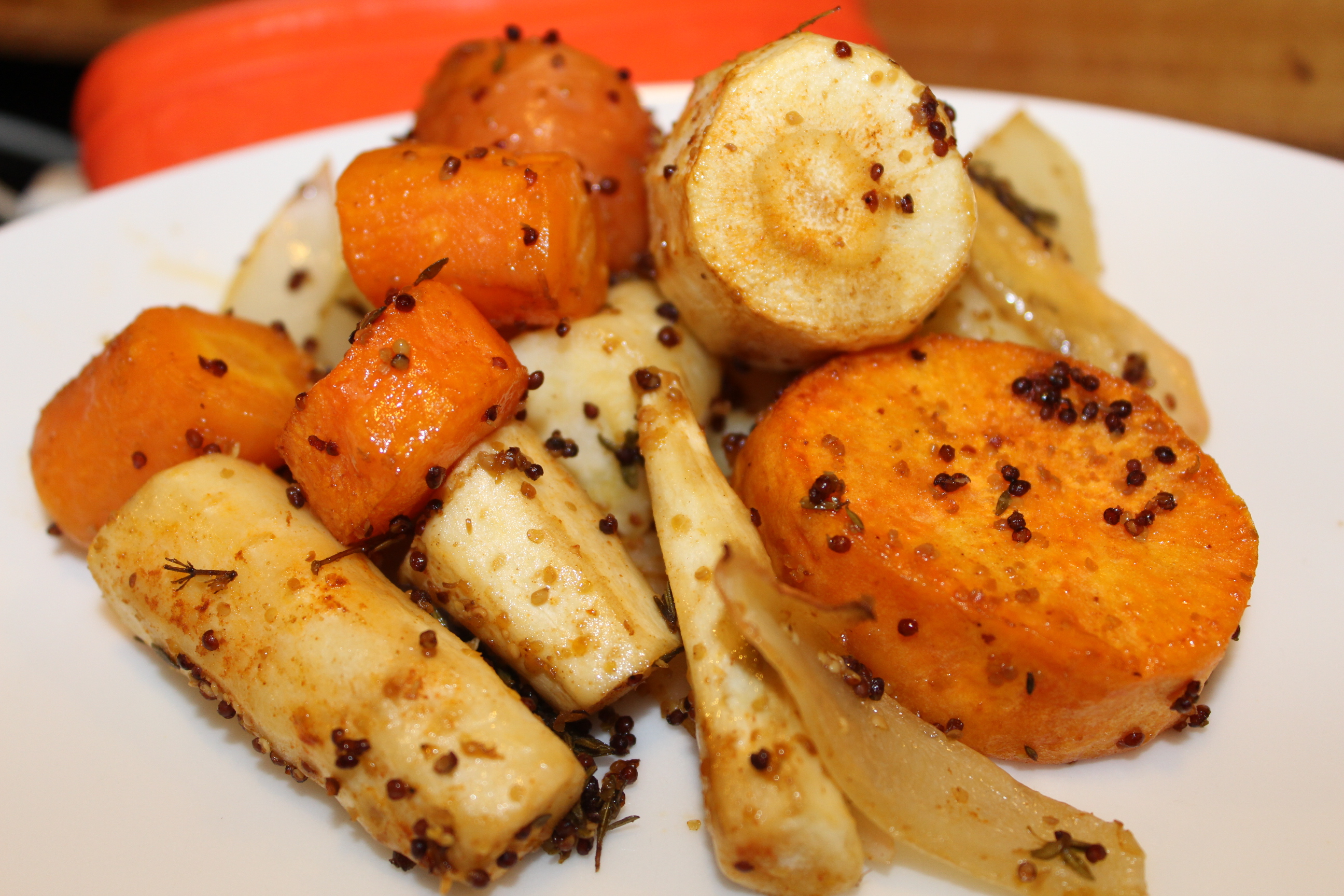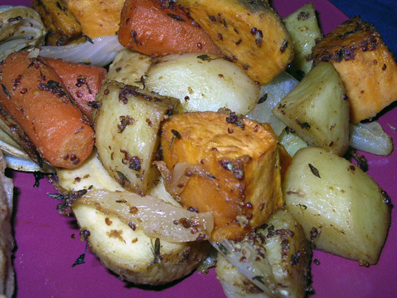 3 tablespoons Dijon mustard, coarse 2 -3 tablespoons olive oil 1 tablespoon mustard oil (optional) 6 sprigs thyme, chopped 1?4 teaspoon paprika 1?4 teaspoon cayenne 1?2 teaspoon sea salt 1?4 teaspoon black pepper, fresh ground 2 carrots, sliced 1-inch lengths 4 parsnips, sliced 1-inch lengths 4 medium potatoes, 1-inch cubes, yukon gold 1 large sweet potato, 1-inch cubes 1 large sweet onion, 1/2-inch wedges