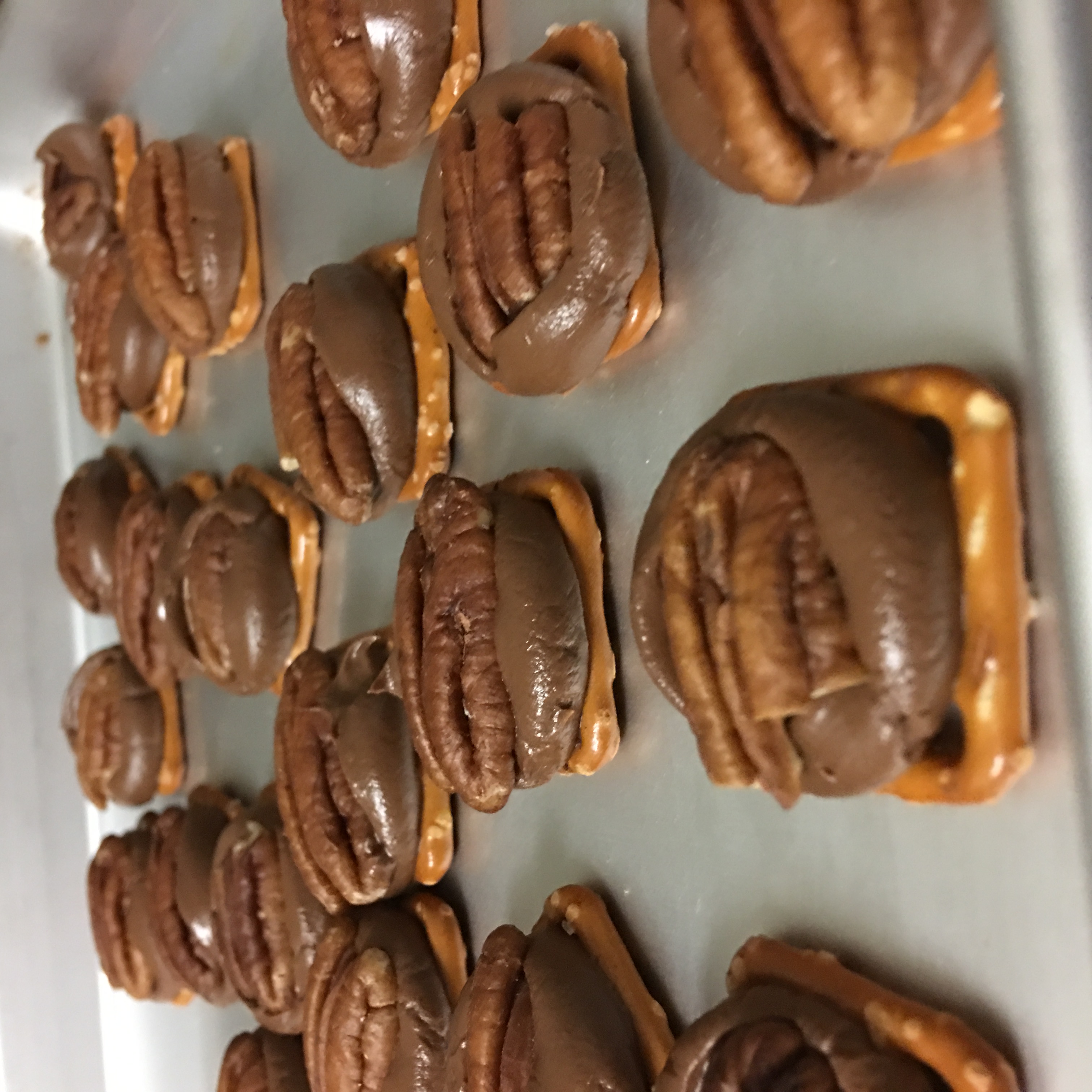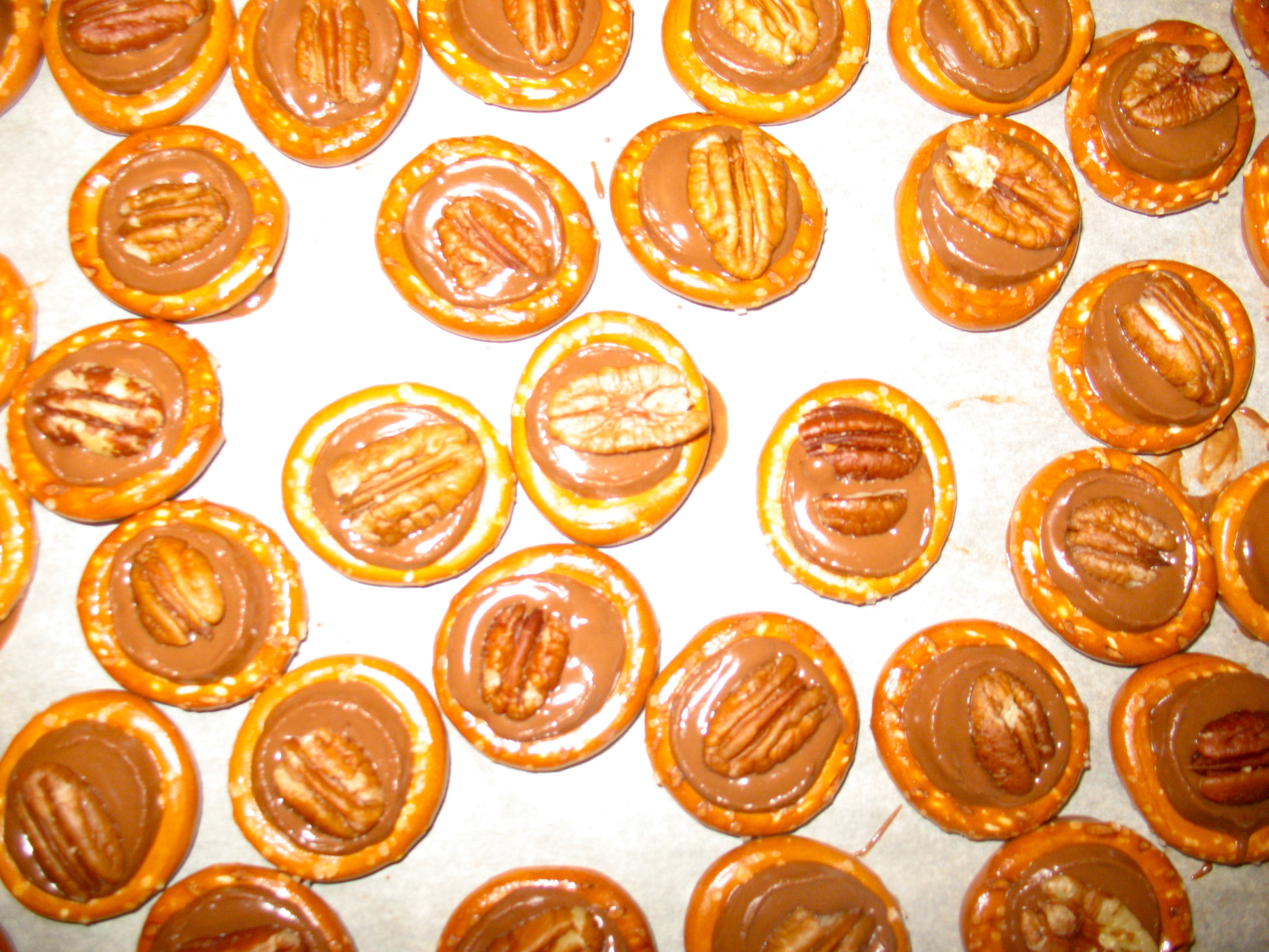 30 Rolo chocolates 30 small pretzels (not sticks, but the flat, figure-8 shaped kind) 30 pecans or 30 walnuts, toasted