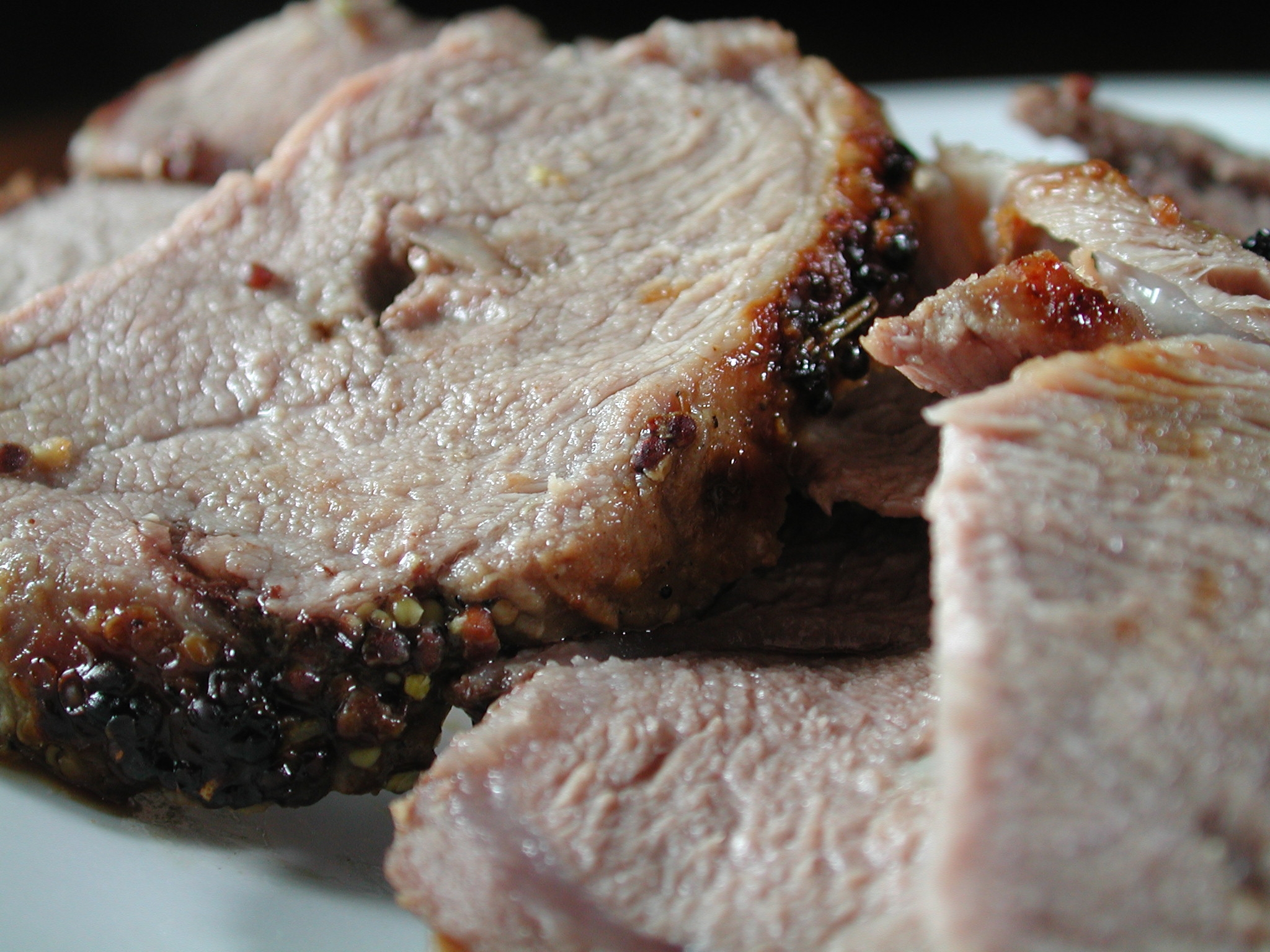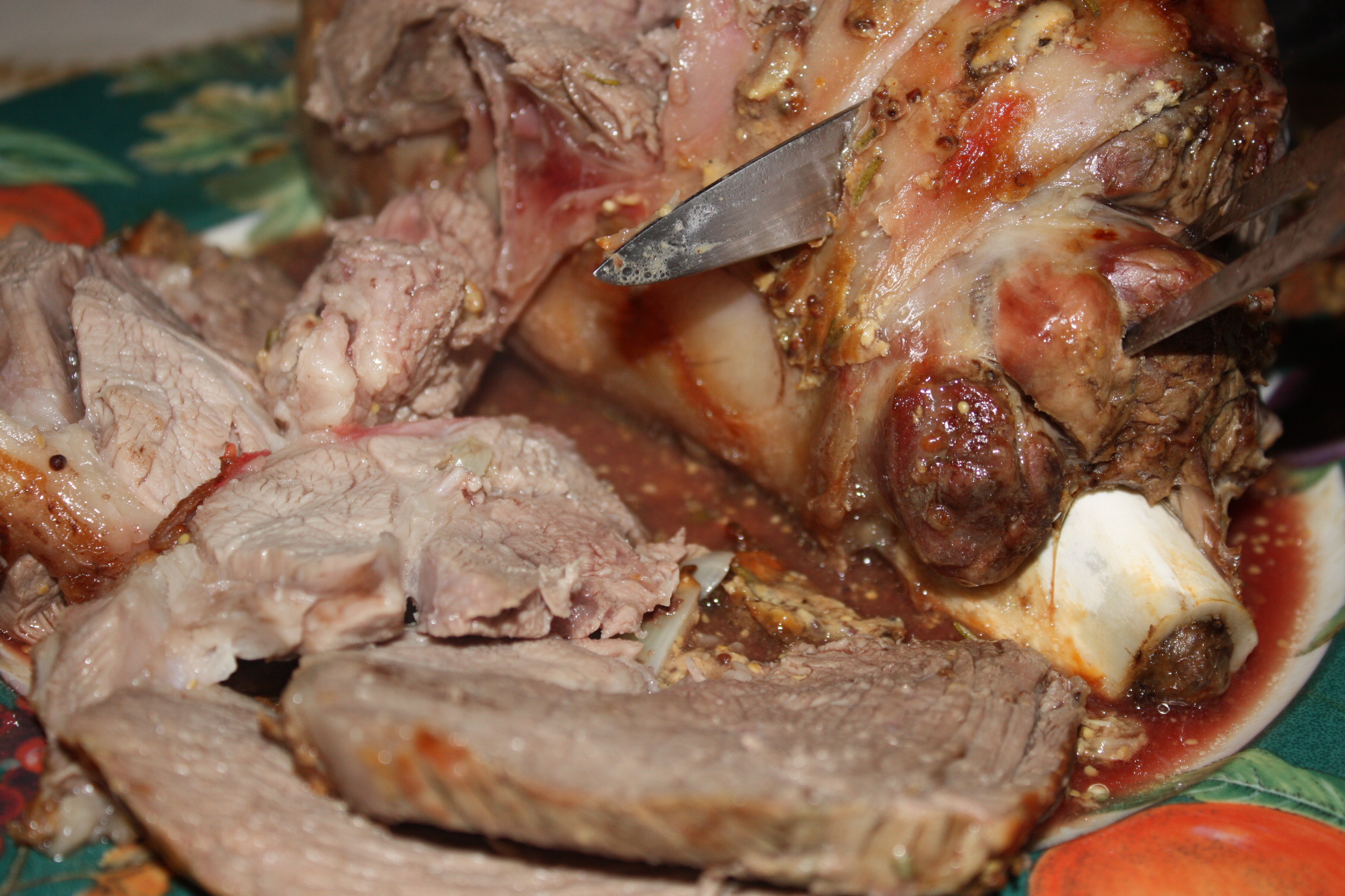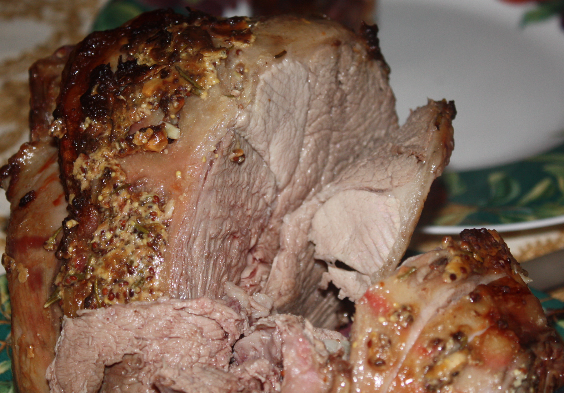 3 tablespoons whole grain Dijon mustard 2 garlic cloves, sliced 1 1?2 teaspoons dried rosemary, crushed 1?2 teaspoon fresh ground black pepper 1 (4 lb) leg of lamb, well trimmed, boned mint jelly