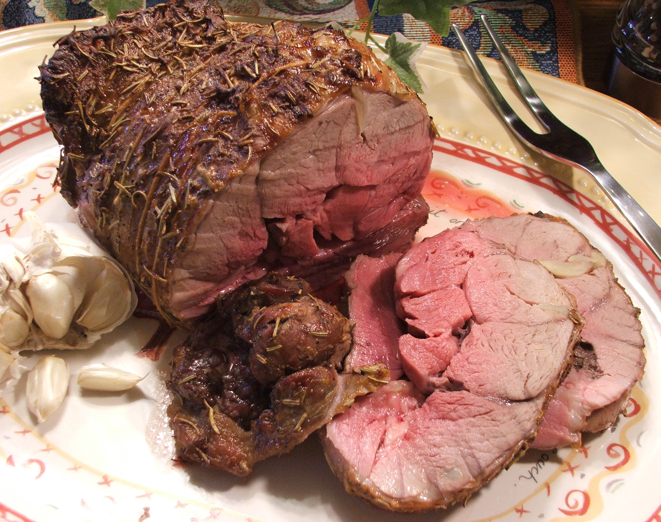 Rinse the lamb under running water, blot dry. With the tip of a sharp knife, make several pockets at random intervals in the meat. Put a sliver of garlic in each, roll the meat into a roll and tie with cooking twine. Mix the mustard, rosemary and black pepper together. Rub over the outside of the rolled meat, wrap meat in foil and place in refrigerator for 4 to 6 hours. Preheat oven to 400 degrees, place the roast on meat rack in shallow roasting pan and insert meat thermometer into thickest part of roast. Add approximately 1 cup of warm water to bottom of roasting pan, the roast should rest on rack above the water. Place roast in preheated oven and cook for 15 minutes. Lower the temperature to 325 degrees and continue roasting for 20 minutes per pound for medium or until meat thermometer registers 145 degrees. If you like your lamb well done, you will need to adjust the cooking time to suit your taste. Remove the roast from the oven and cover with foil allowing to rest for 10 to 15 minutes before carving. While meat is resting, warm about 1/2 cup of mint jelly. Slice into 10 equal portions and serve with warmed jelly.