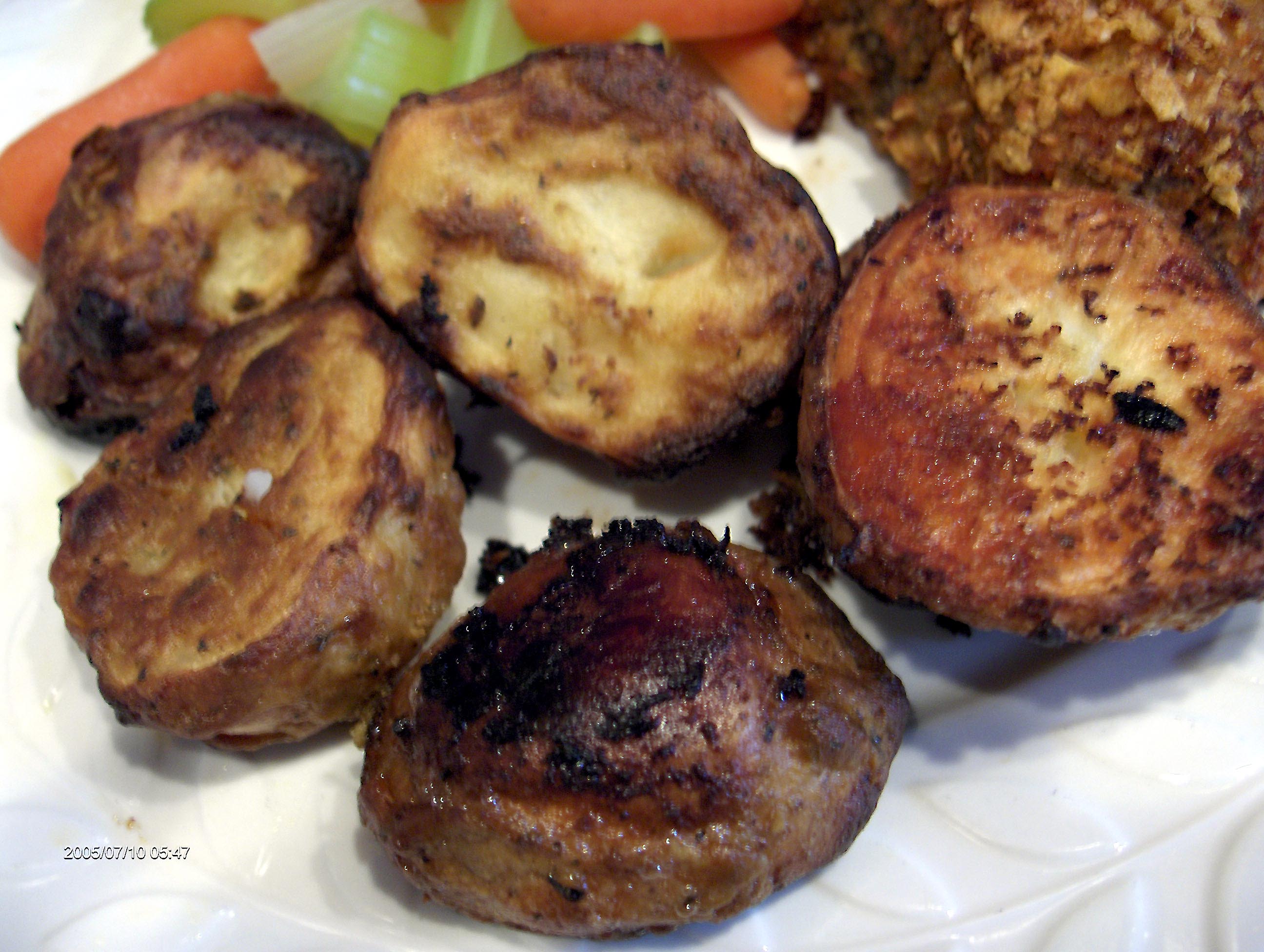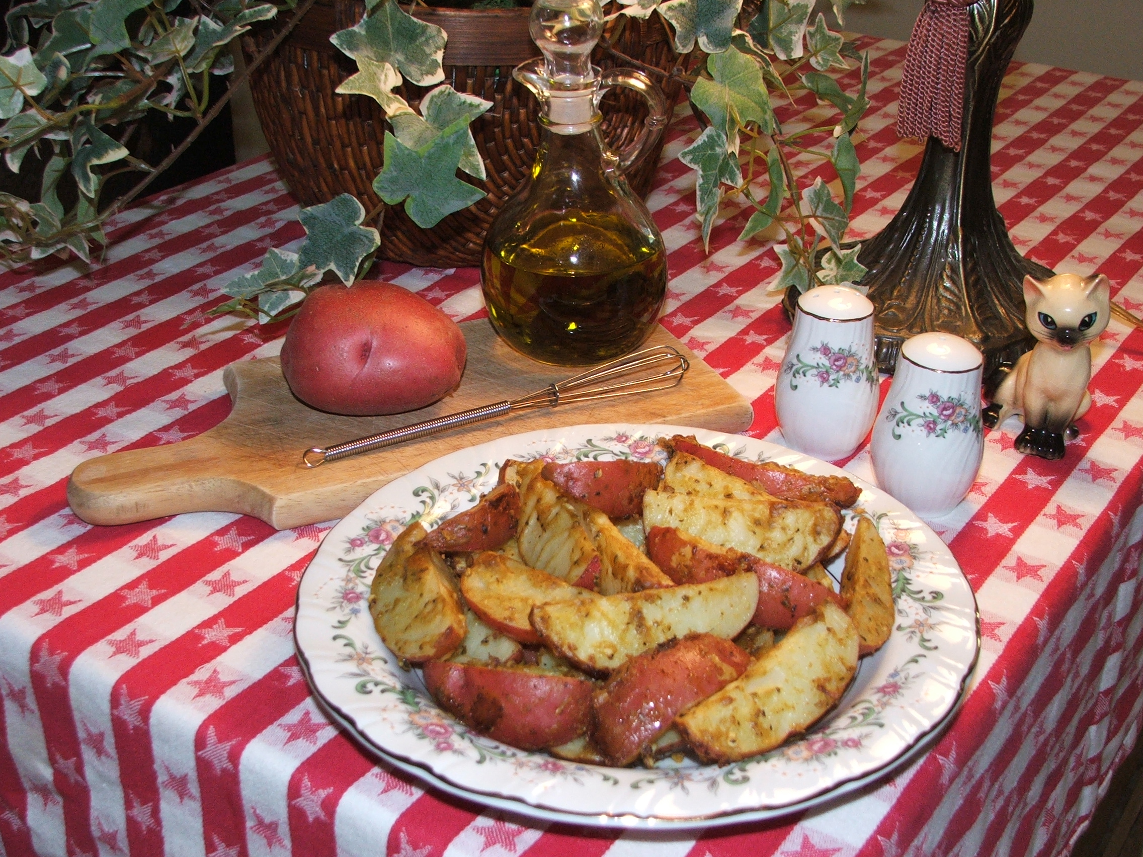 Mix first 4 ingredients in a small bowl. Lightly grease 13 x 9 pan or shallow baking sheet. Toss potatoes with mixture. Bake at 425 for about 40 minutes, or until tender, stirring occasionally.