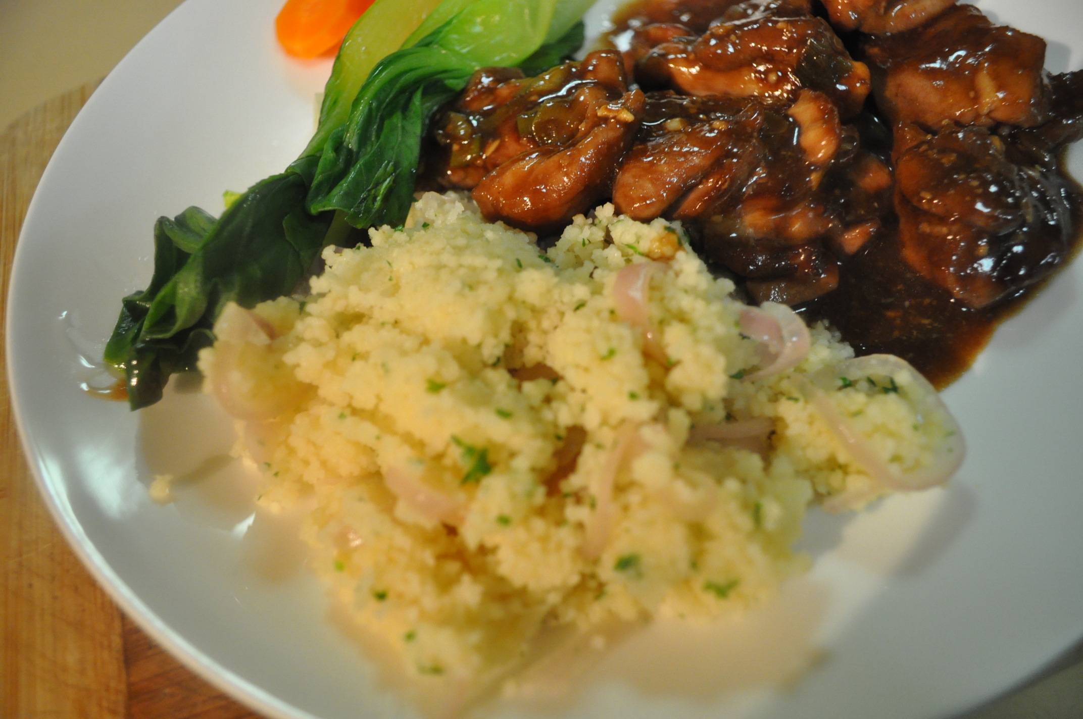 30 g butter 1 onion, finely sliced 1 -2 garlic clove, crushed 1 cup couscous 2 cups chicken stock 2 tablespoons fresh coriander or 2 tablespoons parsley, chopped salt and pepper