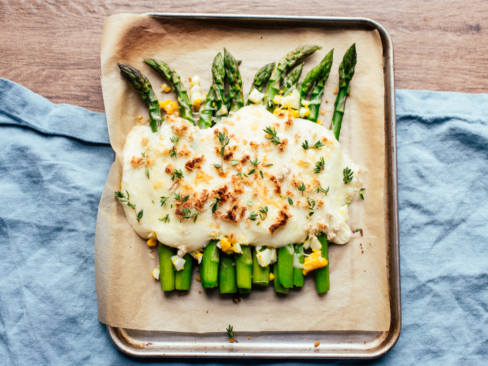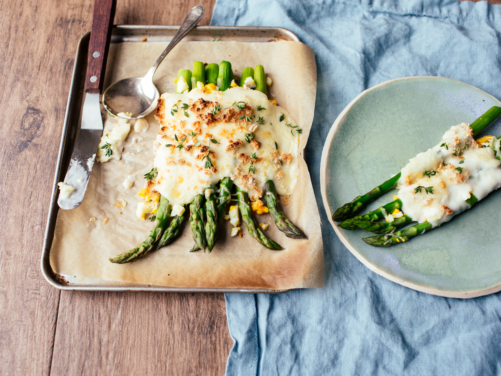1 lb fresh asparagus 4 tablespoons butter 1 tablespoon flour 1 cup milk 2 hard-boiled eggs, finely chopped 1?2 teaspoon salt 1?2 teaspoon cayenne pepper 1?4 cup breadcrumbs 1?4 cup shredded swiss cheese