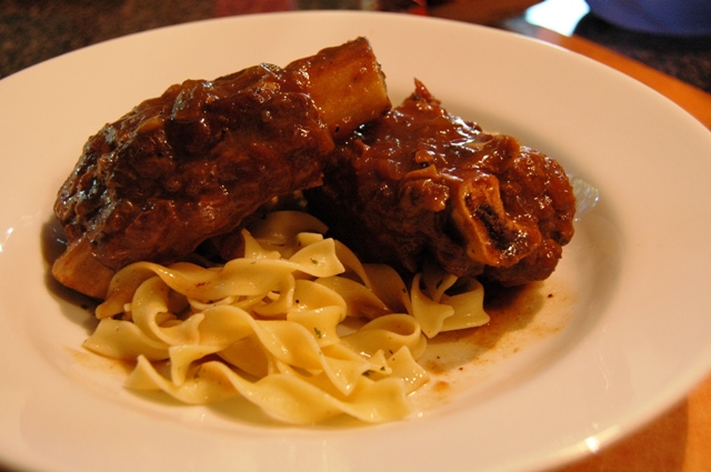Brown short ribs well on all sides (about 30 minutes) in Dutch oven over medium heat. Add broth, onion, 1 c water, peppercorns, worchstershire sauce, garlic, bay leaf and marjoram. Bring to a boil; reduce heat, cover and cook slowly 2 to 2 1/2 hours or until tender, turning once. Meanwhile, prepare Horseradish Sauce. Place short ribs on serving platter and keep warm. Skim fat from cooking liquid. Combine flour with 1 /2 cup water, mixing until smooth; combine with cooking liquid, bring to a boil, stirring constantly, reduce heat and cook slowly 3 minutes. Strain, if necessary, and serve with short ribs. Garnish platter with tomato wedges and parsley. Serve Horseradish sauce with short ribs. HORSERADISH SAUCE. 1/4 Cup Dairy Sour Cream 1 T Prepared Mustard 2 1/2 T Prepared Horseradish 1/8 t Salt Combine sour cream, horseradish, mustard and salt in small bowl. Cover and refrigerate.