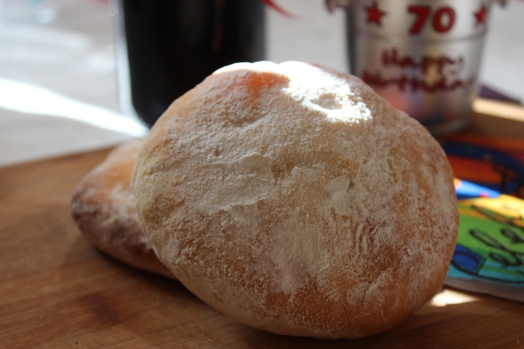 1?2 ounce fresh yeast 1 teaspoon sugar, for creaming the yeast 1?2 pint milk, and water, mixed and warmed to blood heat (more if necessary) 1 lb strong white bread flour 1 teaspoon salt 2 ounces butter flour, for dusting