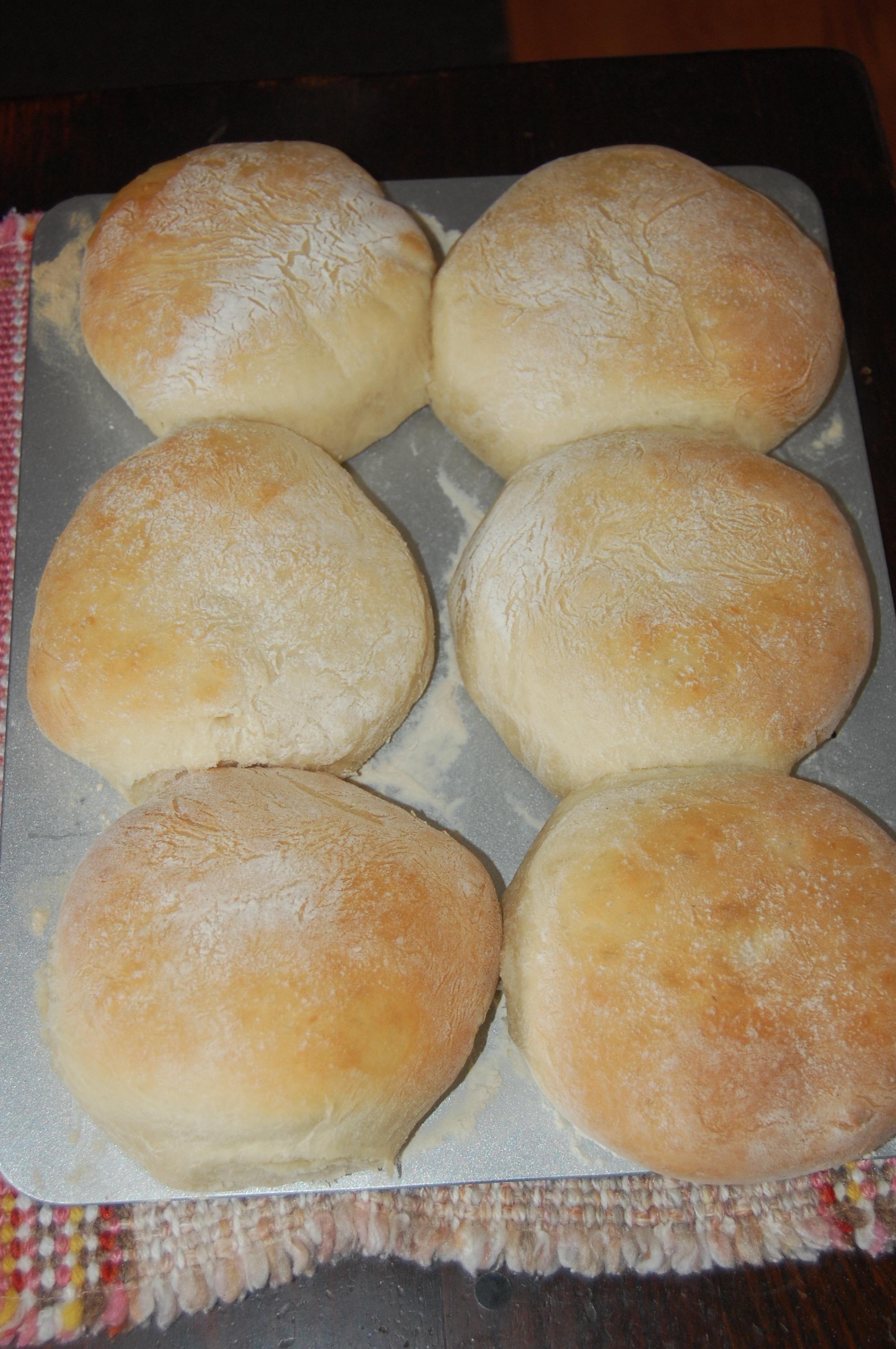 Rub the butter into the flour and make a well in the centre. Cream the yeast with the sugar, then add the liquid and salt, and pour into the well. Mix to a slack dough, adding extra warm liquid if required. Allow to rise until the dough has doubled in bulk, for about an hour or two according to temperature. Knead, and divide in eight even pieces. Knead each into a ball about the size of a fist, and flatten with the hand. Then lightly roll to a round with a rolling-pin. Place the ball doughs on a well-floured baking tray/s, lightly pressing your thumb in to the middle of the baps. Brush with milk and sprinkle flour all over the top of the baps. Prove for 15 to 20 minutes until well risen. Bake in the oven at 200C (400F) mark 6 for 10 minutes, or until firm and lightly golden brown, but still soft - tap them underneath and they should sound hollow when they are cooked. . Cool on a wire rack. Dust with more flour. These freeze very well - serve them with assorted fillings for sandwiches or just split whilst warm and spread with butter. US conversions: 1 lb flour = 4 cups. 2 ozs butter = 1/2 stick butter.