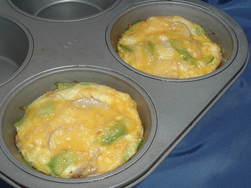 Preheat oven to 350F. Coat a 6 cup non-stick muffin pan with cooking spray or line with paper baking cups. In a medium non-stick skillet, cook the sausage, peppers, and onions for 5 minutes, or until sausage is no longer pink. Spoon mixture and cool slightly. Stir in eggs and mushrooms. Evenly divide mixture into 6 muffin cups; Sprinkle with cheese. Bake for 20 minutes, or until egg is set.