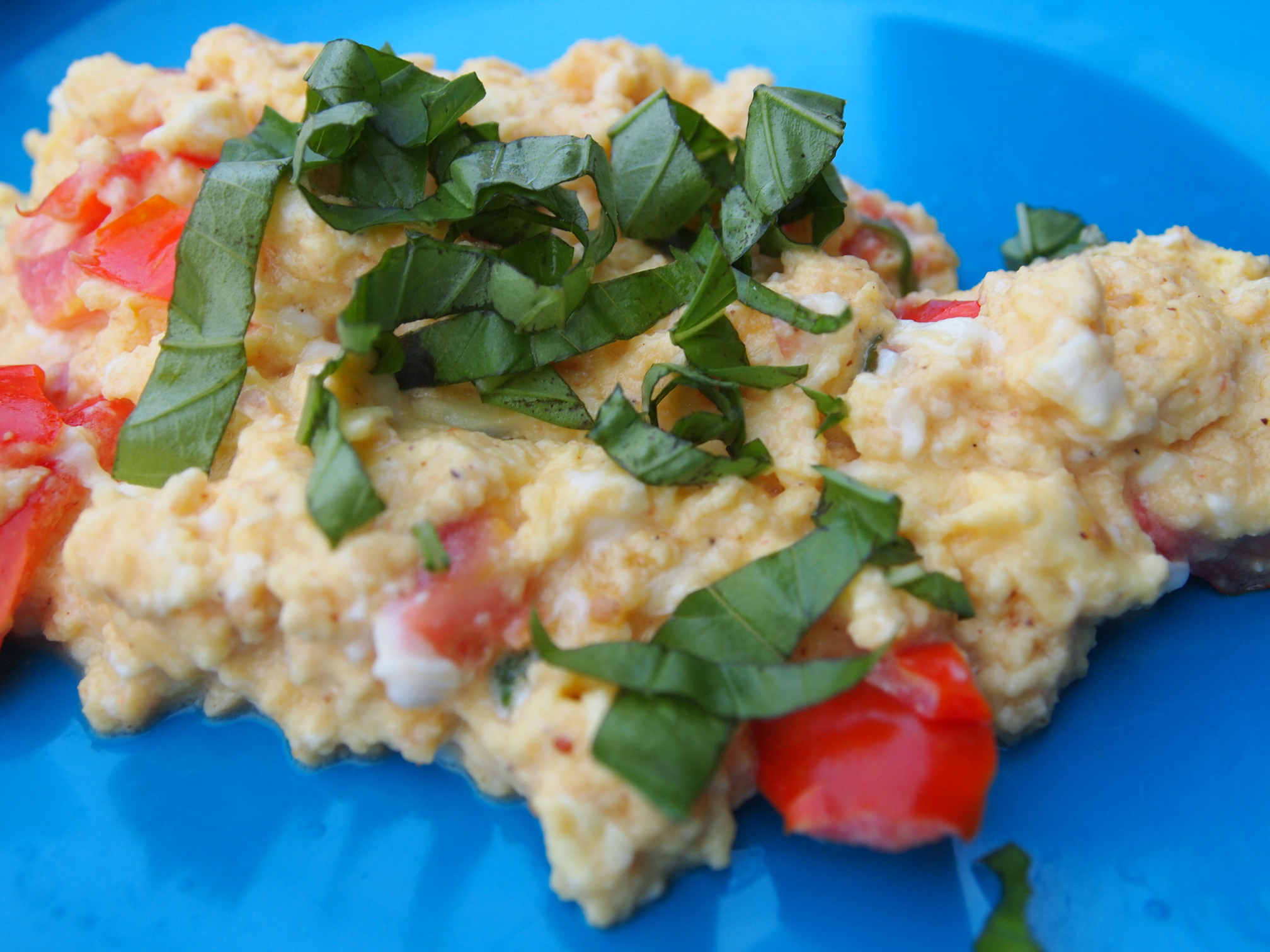 12 large eggs 3 tablespoons fresh herbs, finely chopped (I used parsley, tarragon and chives) 1 teaspoon salt 1?2 teaspoon fresh ground black pepper 3 tablespoons creme fraiche (or heavy creme) 2 tablespoons Dijon mustard 2 tablespoons butter 3 tomatoes, peeled, seeded, diced, and drained (home grown are best)