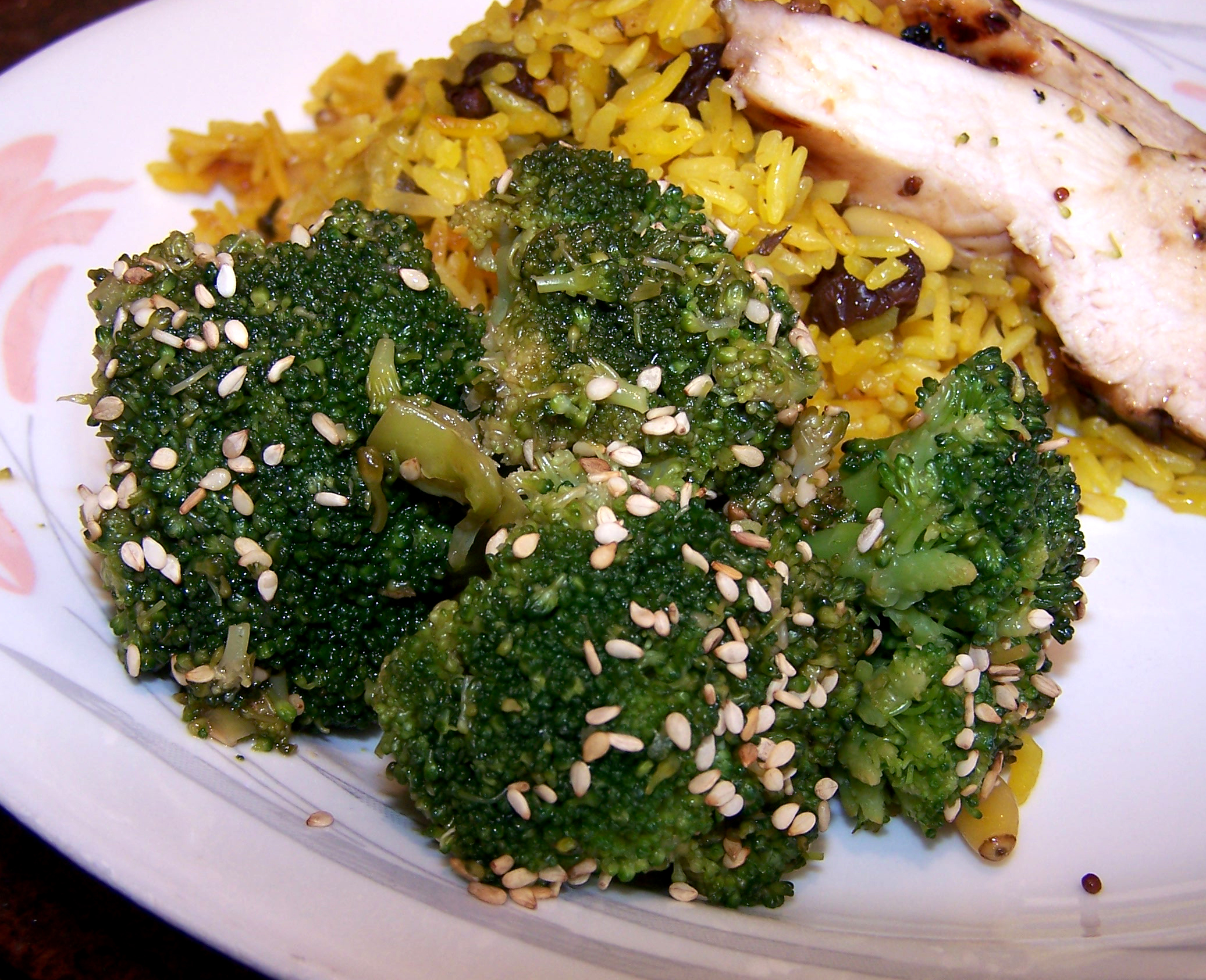 Steam broccoli until crisp-tender. Combine remaining ingredients except sesame seed in a small bowl. Pour sauce over broccoli and toss well. Sprinkle with sesame seeds.