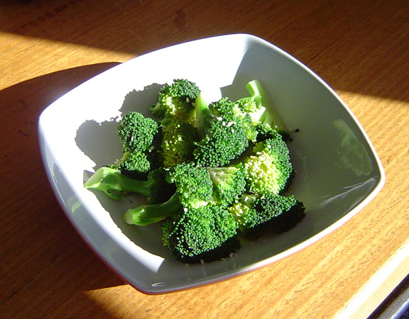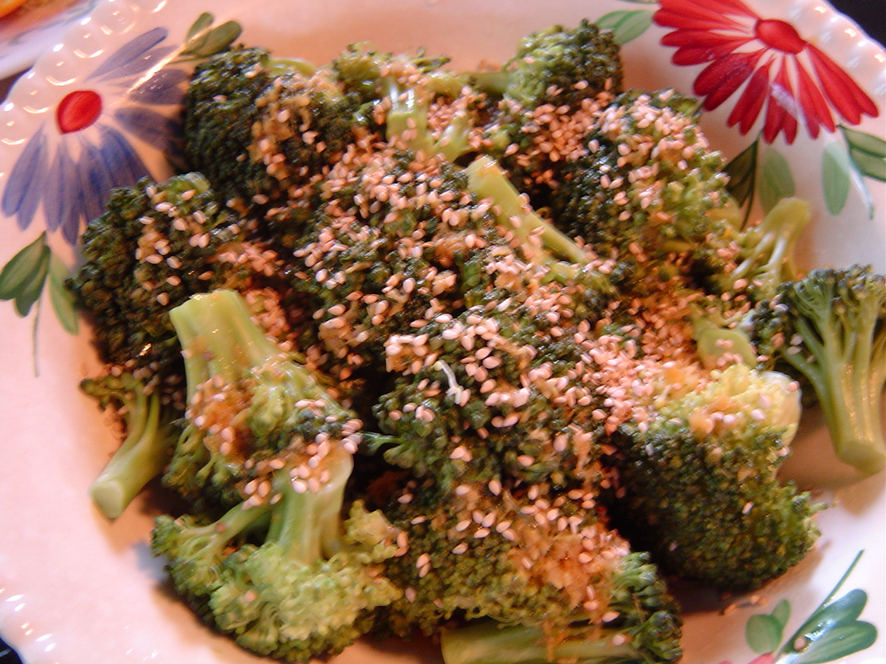 2 lbs broccoli florets 1?2 tablespoon grated ginger 1 1?2 tablespoons soy sauce 2 1?2 tablespoons orange juice 1 teaspoon sesame oil 1 1?2 teaspoons toasted sesame seeds