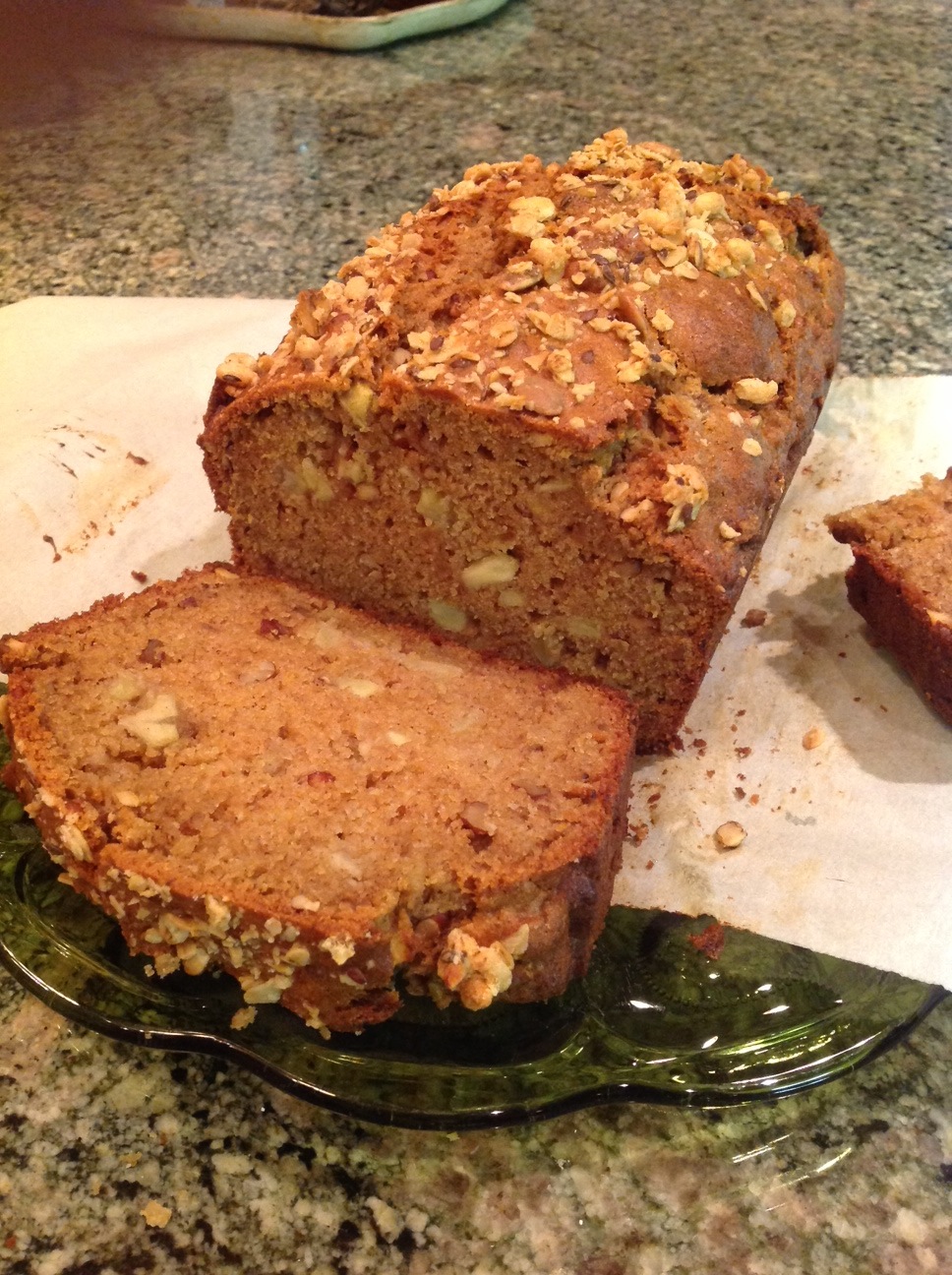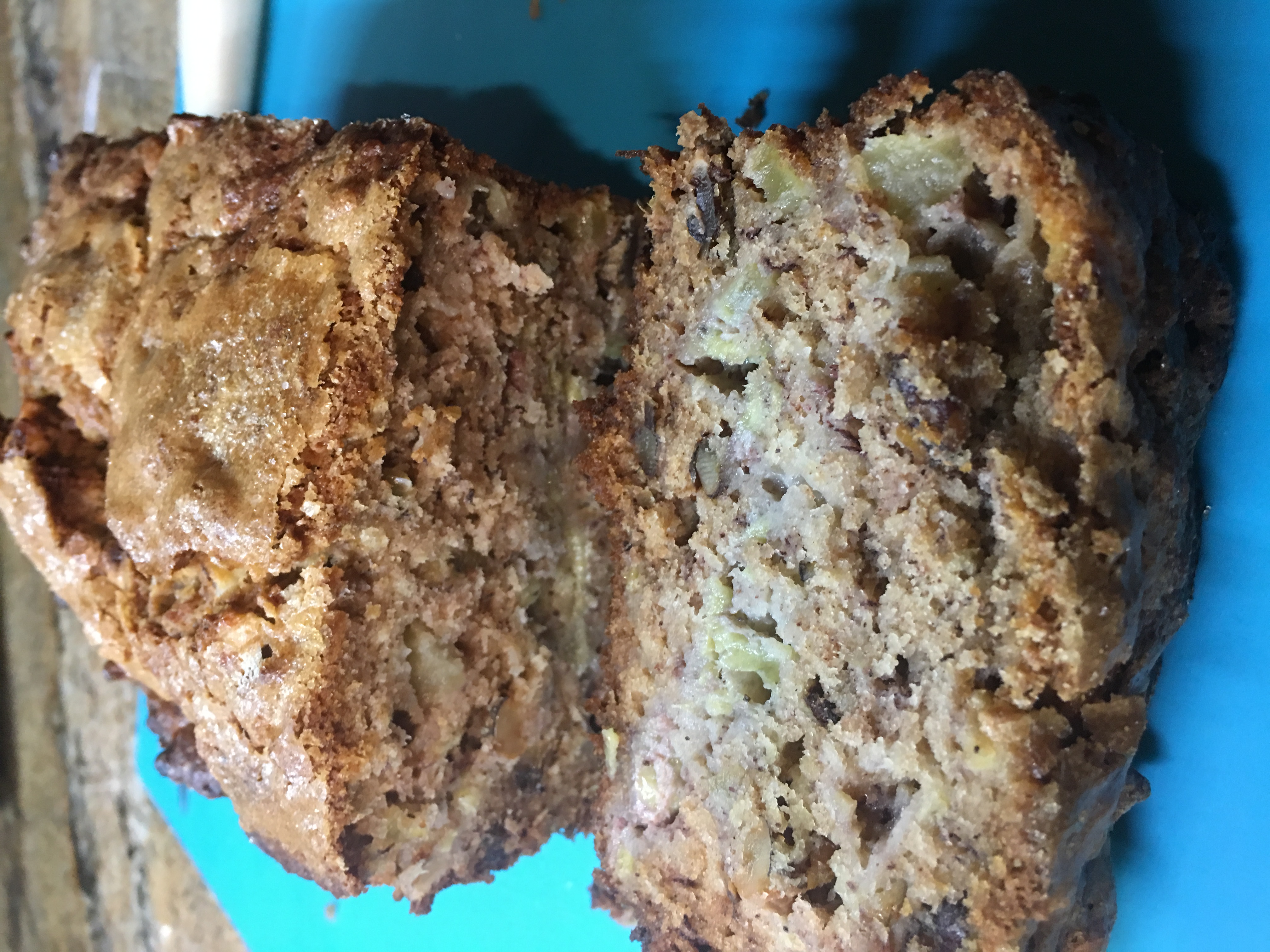 1 3?4 cups flour 3?4 teaspoon baking soda 1?4 teaspoon salt 1 cup sugar 2 eggs 2?3 cup vegetable oil 3 tablespoons milk 2 large bananas (mashed) 1?2 cup nuts (chopped) 1 large apple (peeled, cored, chopped)
