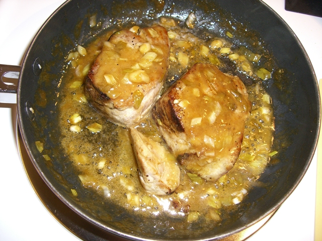 Drizzle sesame oil on both sides of each tuna steaks. Season with salt and pepper. Combine remaining ingredients in a small sauce pan. Heat over low heat until butter is melted, stirring constantly to mix and prevent scorching. While sauce is heating, heat a heavy frying pan on another burner with high heat. Place tuna in pan and sear until crispy and brown. Turn and sear on the other side. Note: Tuna steak fans who like their tuna on the rare side (like me) will usually find 2 minutes searing time is ample. Folks who like their tuna steaks more well-done (like my DH) may want to sear their tuna for 4-5 minutes per side.