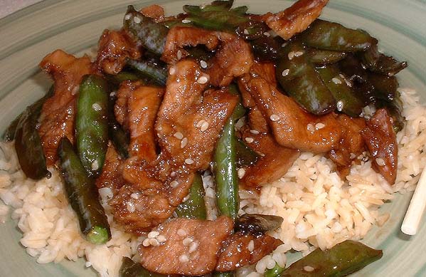 2 tablespoons sesame seeds, toasted 1 tablespoon sesame oil or 1 tablespoon vegetable oil 1 lb pork loin or 1 lb pork leg, cut into thin strips 2 tablespoons honey 3 tablespoons soy sauce 1?2 teaspoon ground ginger 1?3 lb snow peas, washed, ends removed