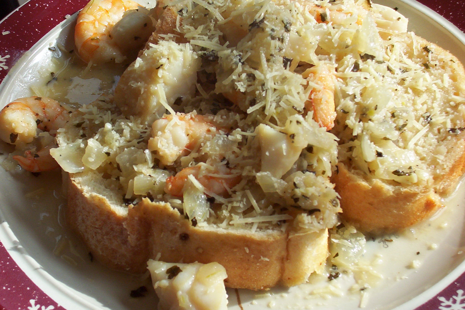 3 tablespoons olive oil 1 large onion, chopped 6 cloves garlic, minced 1 lb small shrimp or 1 lb medium shrimp, peeled 1 lb scallops, quartered 1 cup white wine 2 tablespoons fresh basil or 2 teaspoons dried basil 1?2 teaspoon red pepper flakes 1?4 cup chicken stock 1 teaspoon sugar 1?3 cup butter 1 lemon, juice of salt ground pepper 1?4 cup parsley, chopped 1?4 cup grated parmesan cheese