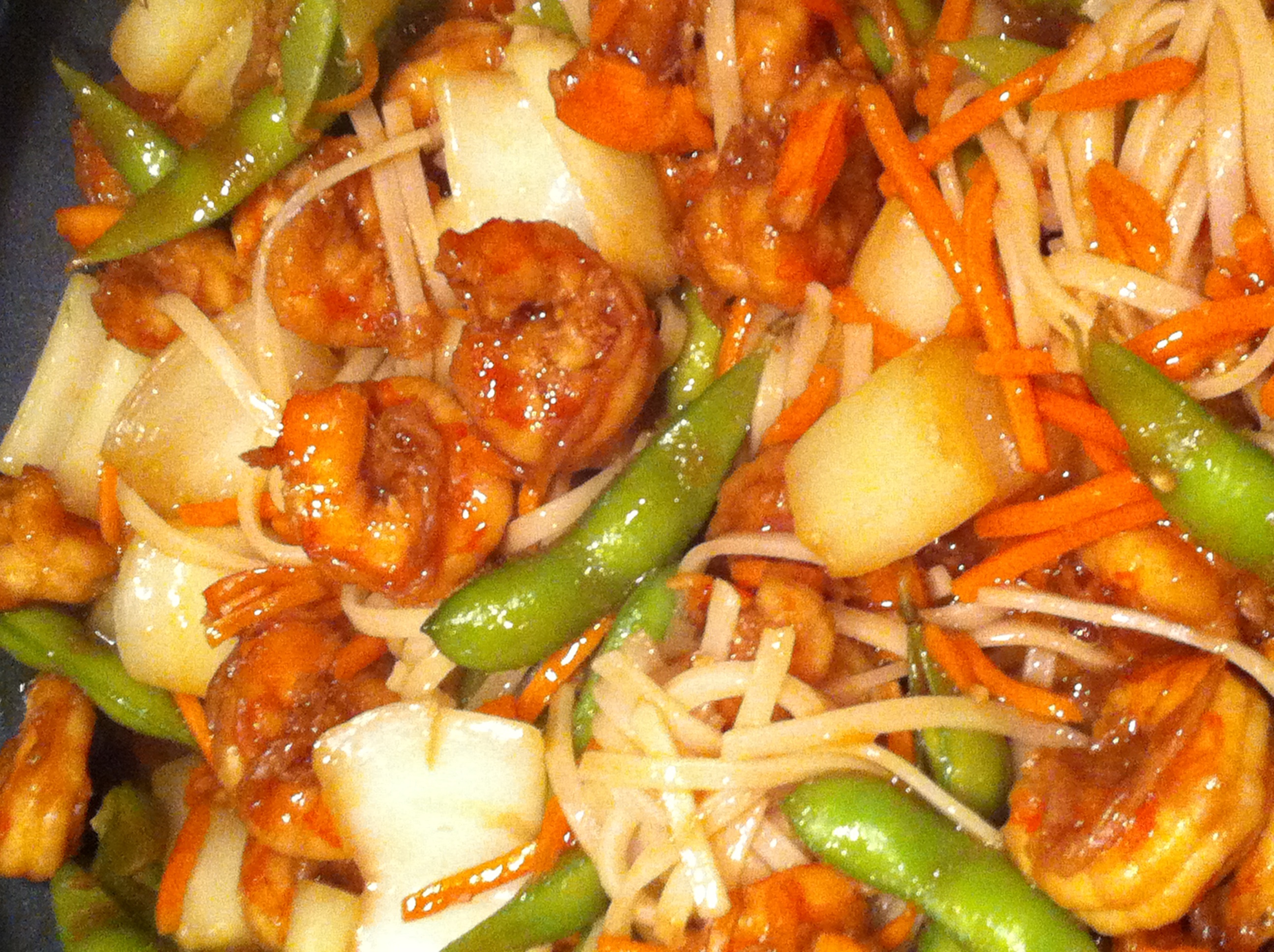 2 lbs medium shrimp, peeled and deveined 1?2 cup soy sauce 8 teaspoons cornstarch 1?2 tablespoon grated fresh ginger 6 cloves garlic, minced 4 teaspoons sesame oil, divided 12 ounces snow peas 2 cups shredded carrots 1 head bok choy, sliced 1 (15 ounce) can chicken broth 7 scallions, sliced 12 ounces fettuccine, cooked and drained