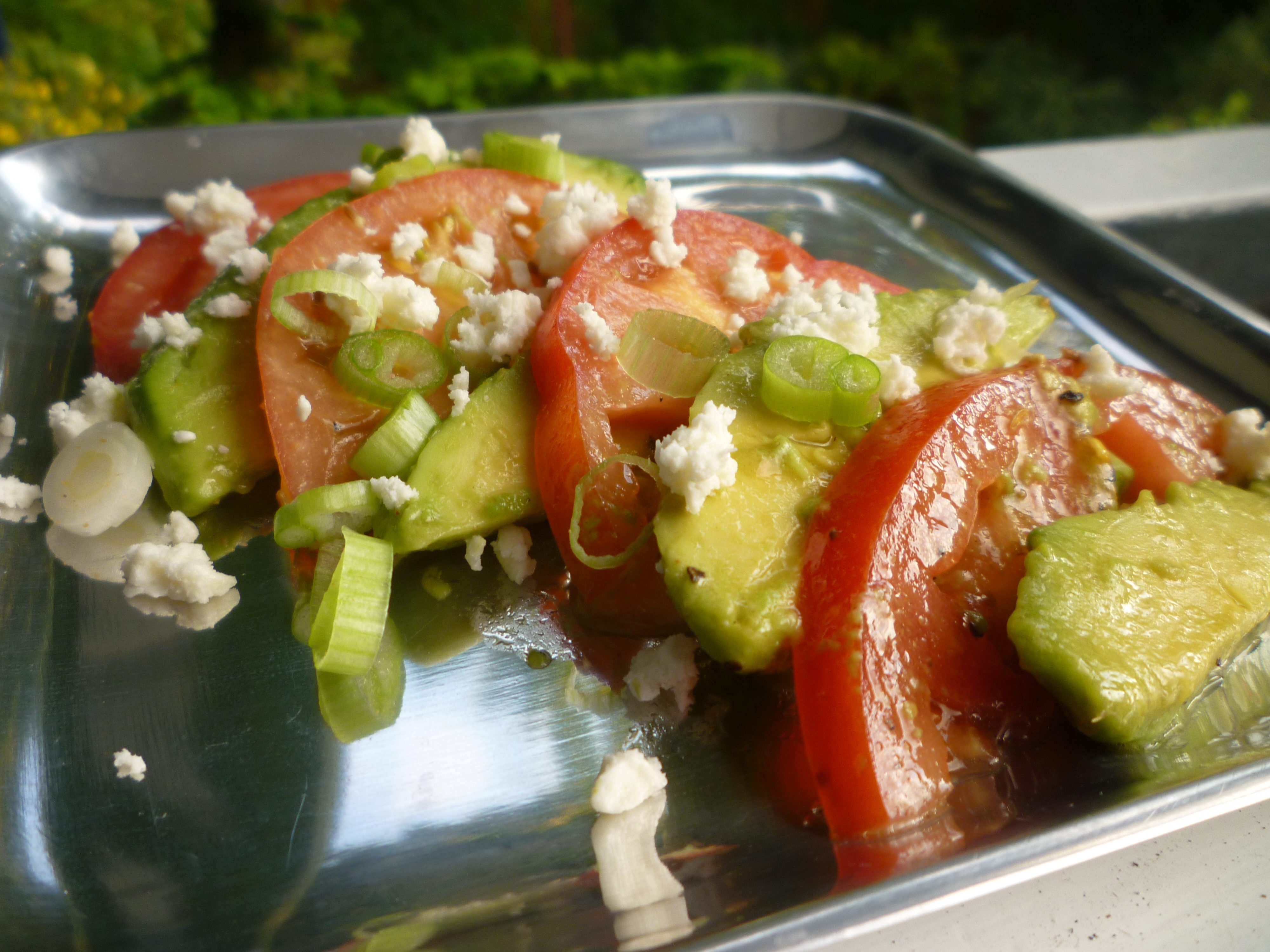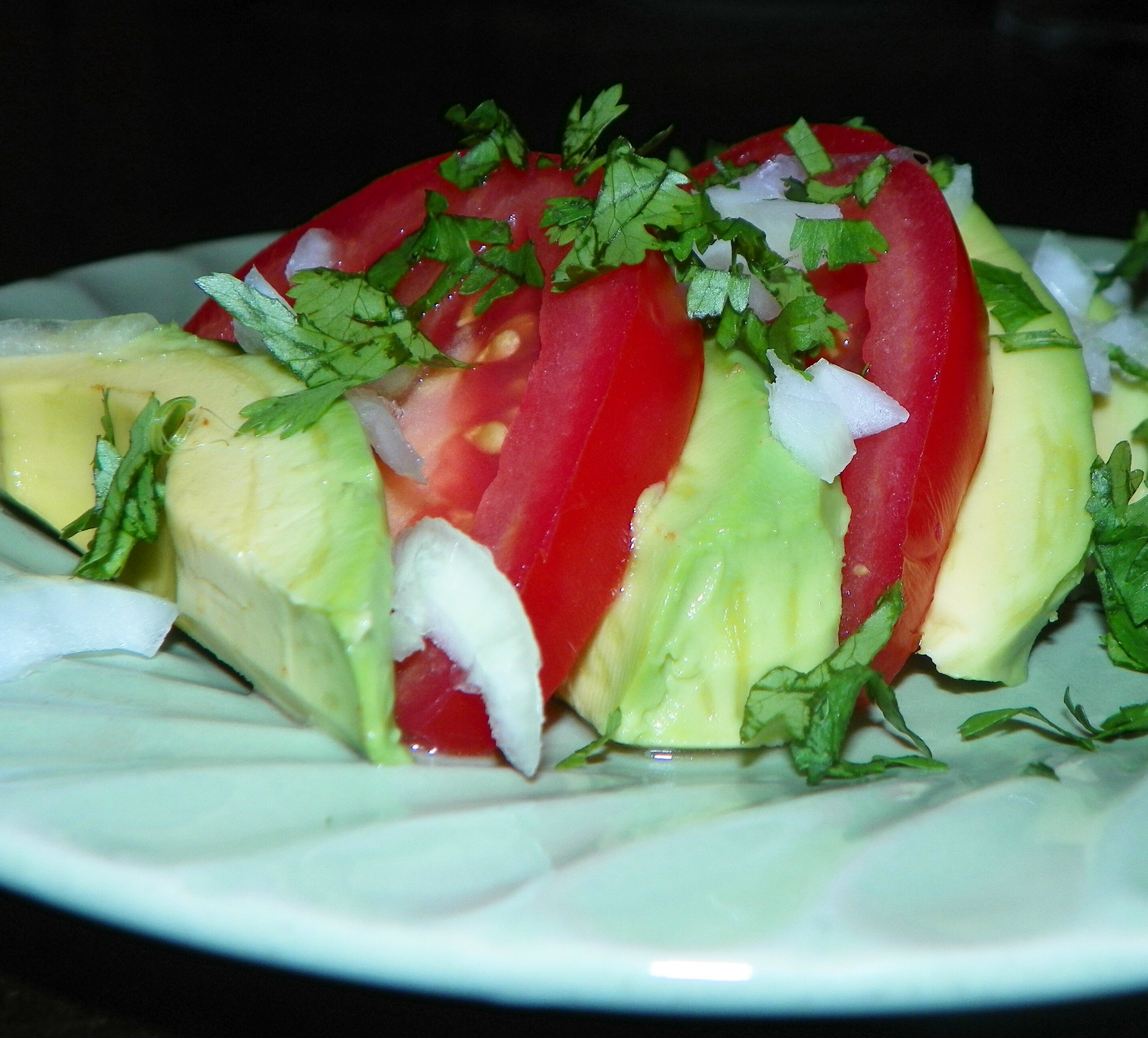 Slice avocado and tomato into 1/4" thick slices. Arrange on a serving plate, alternating tomato slices with one or two avocado slices. Scatter with sweet onion and cilantro. Make dressing by combining olive oil, lime juice, cumin, and salt and pepper and shaking or whisking until well mixed. Drizzle dressing over avocado and tomato.
