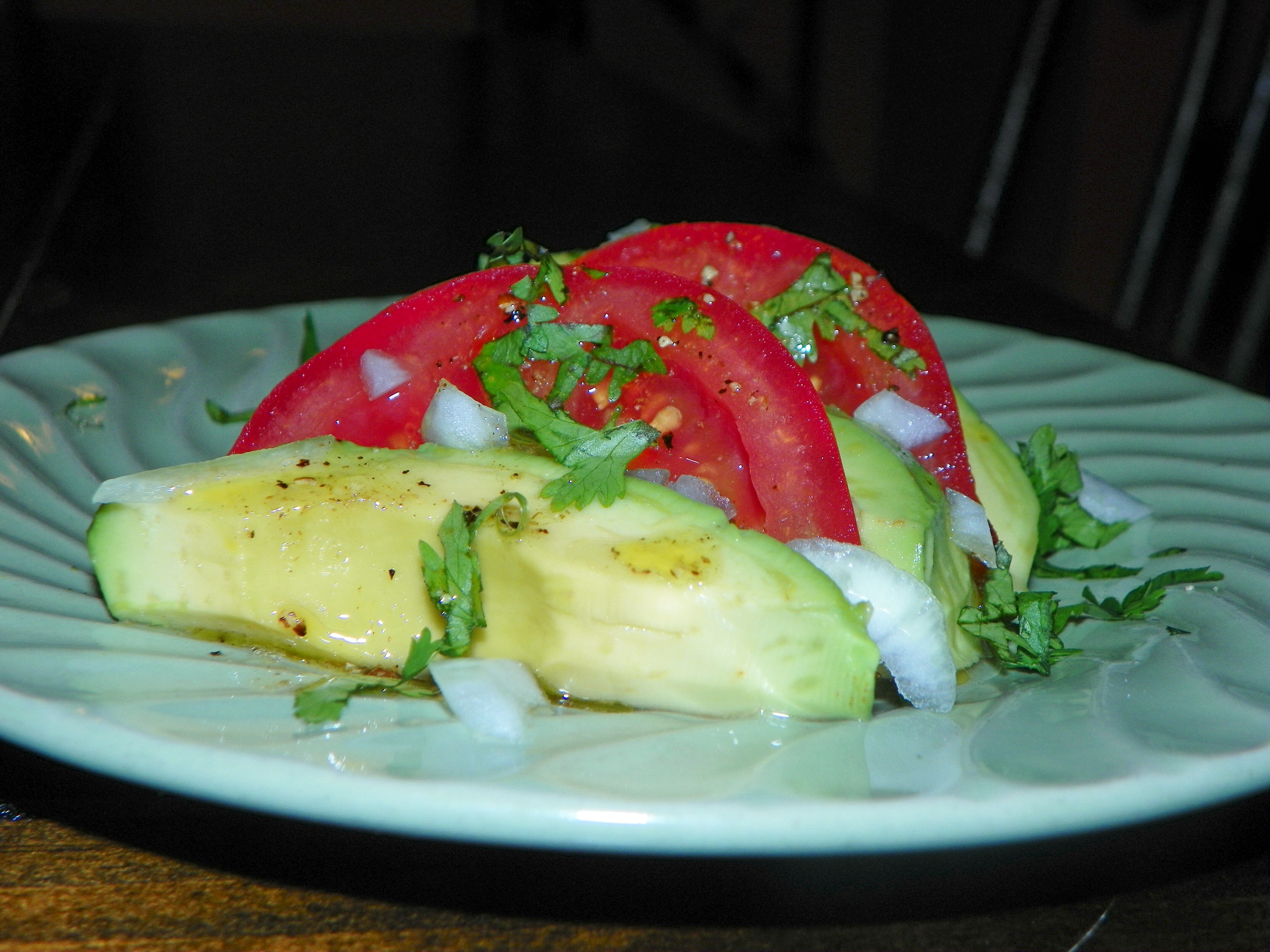 SALAD 1 avocado, pitted & halved 1 large tomatoes 2 tablespoons sweet onions, chopped fine 2 tablespoons cilantro, chopped DRESSING 1 tablespoon olive oil 1 teaspoon lime juice 1?8 teaspoon cumin salt and pepper, to taste