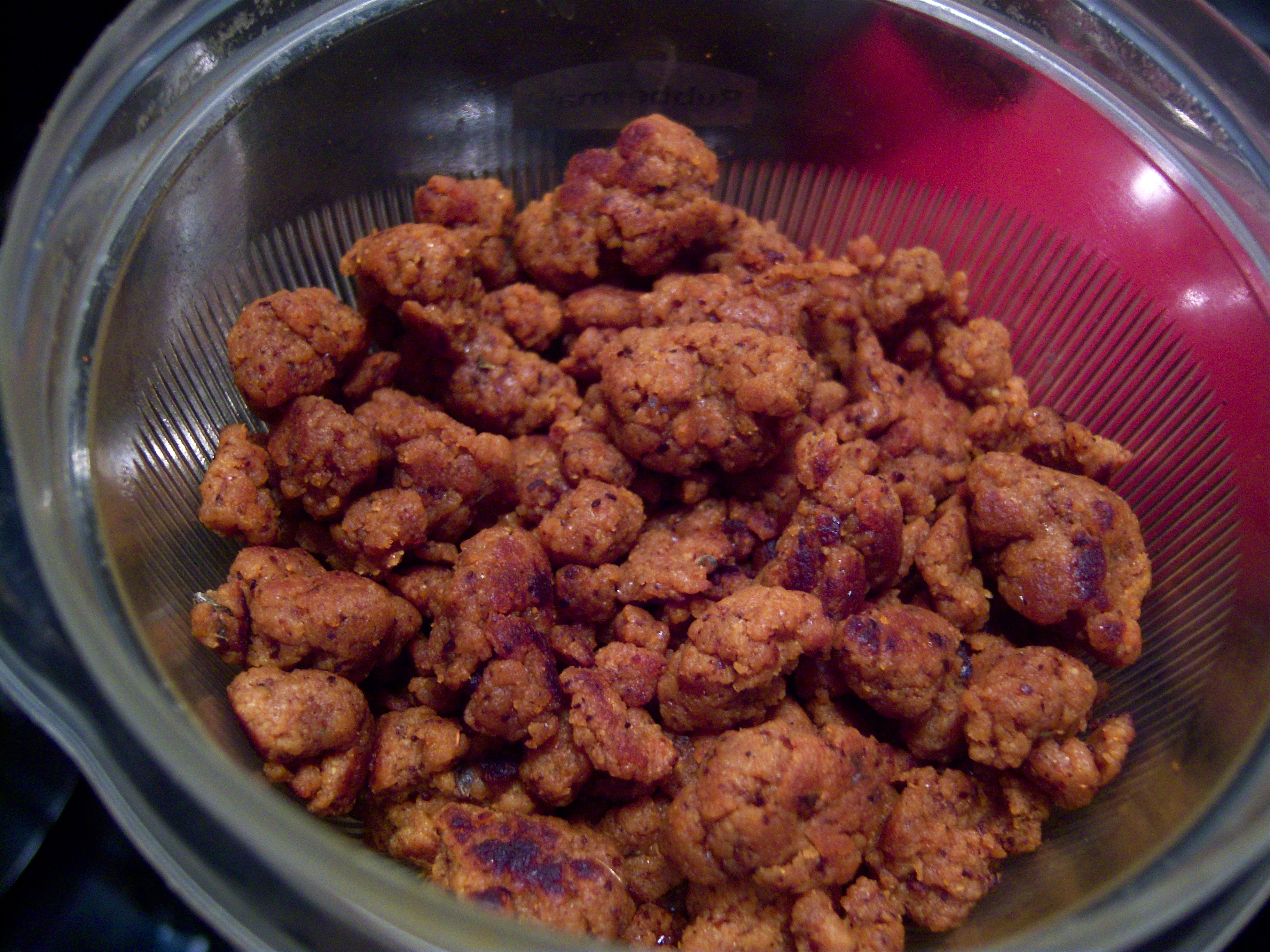 1?2 cup vital wheat gluten 2 tablespoons nutritional yeast 1?2 teaspoon fine sea salt 1 teaspoon ground cumin 1?4 teaspoon cayenne pepper 1?2 teaspoon paprika 2 teaspoons chili powder 1?2 teaspoon dried onion flakes (or 1/4 teaspoon onion powder) 2 tablespoons water 2 tablespoons apple cider vinegar 2 tablespoons ketchup 1 tablespoon canola oil