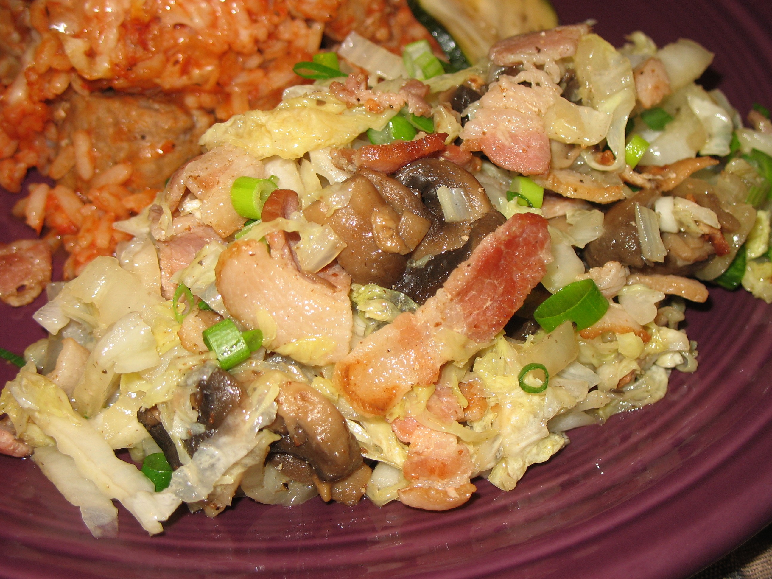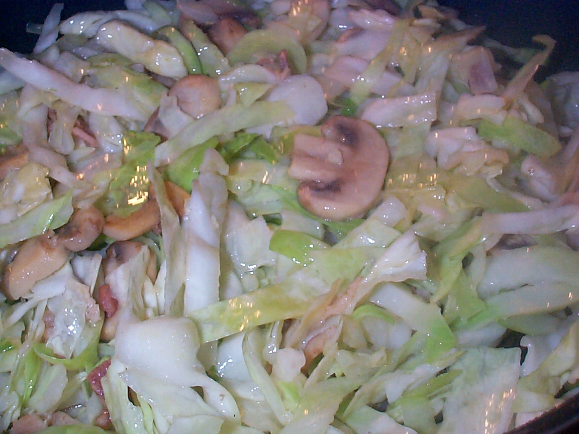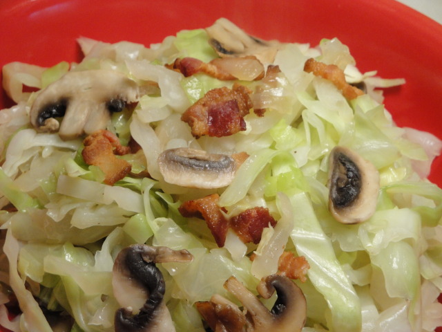 60 g butter 4 slices rindless bacon, chopped 8 mushrooms, sliced 600 g cabbage, shredded 1 spring onion (scallion) (optional) black pepper